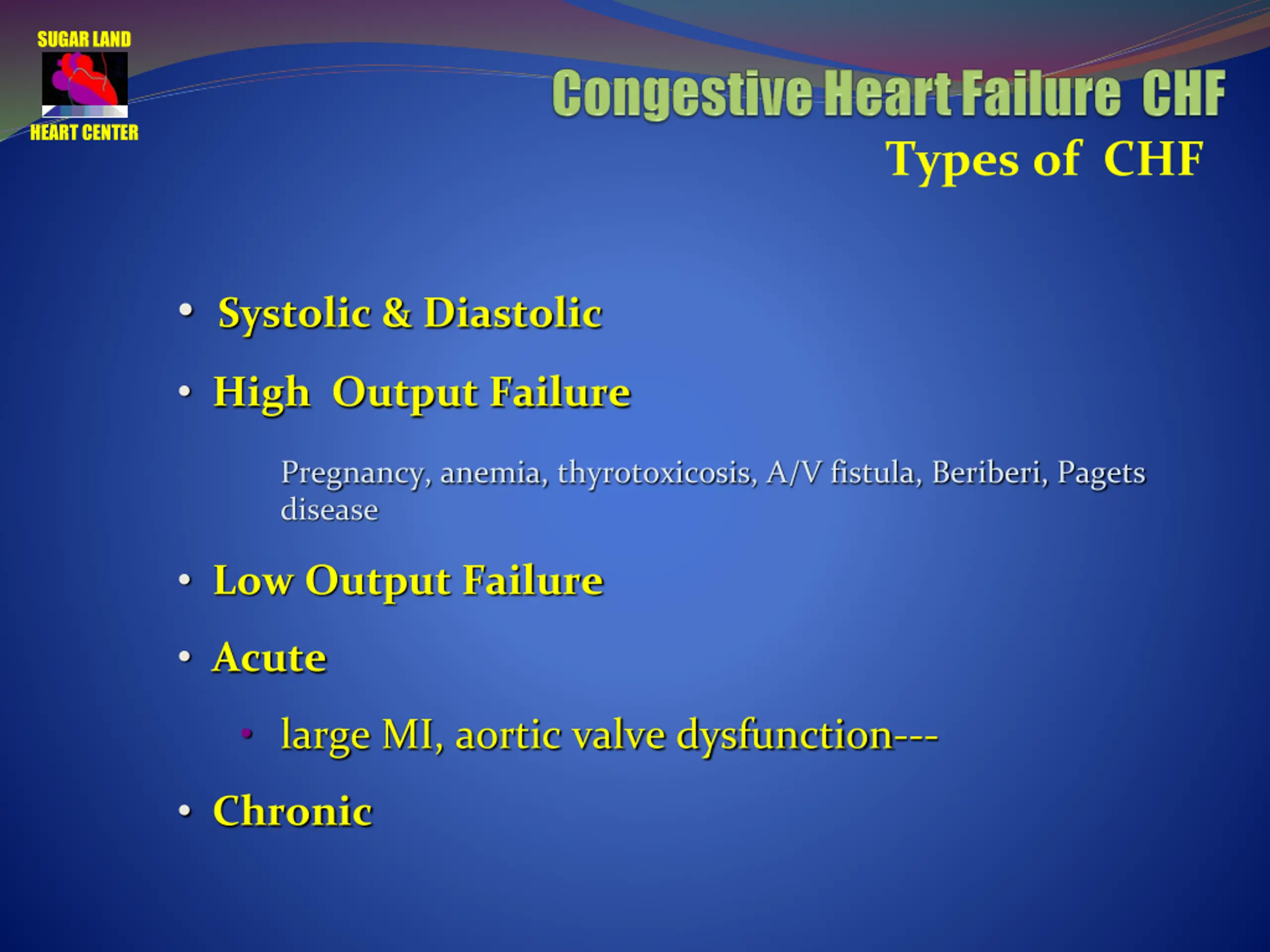 SUGAR LAND HEART CENTER Types of CHF Systolic & Diastolic High Output Failure Pregnancy, anemia, thyrotoxicosis, A/V fistula, Beriberi, Pagets disease Low Output Failure Acute large MI, aortic valve dysfunction--- Chronic