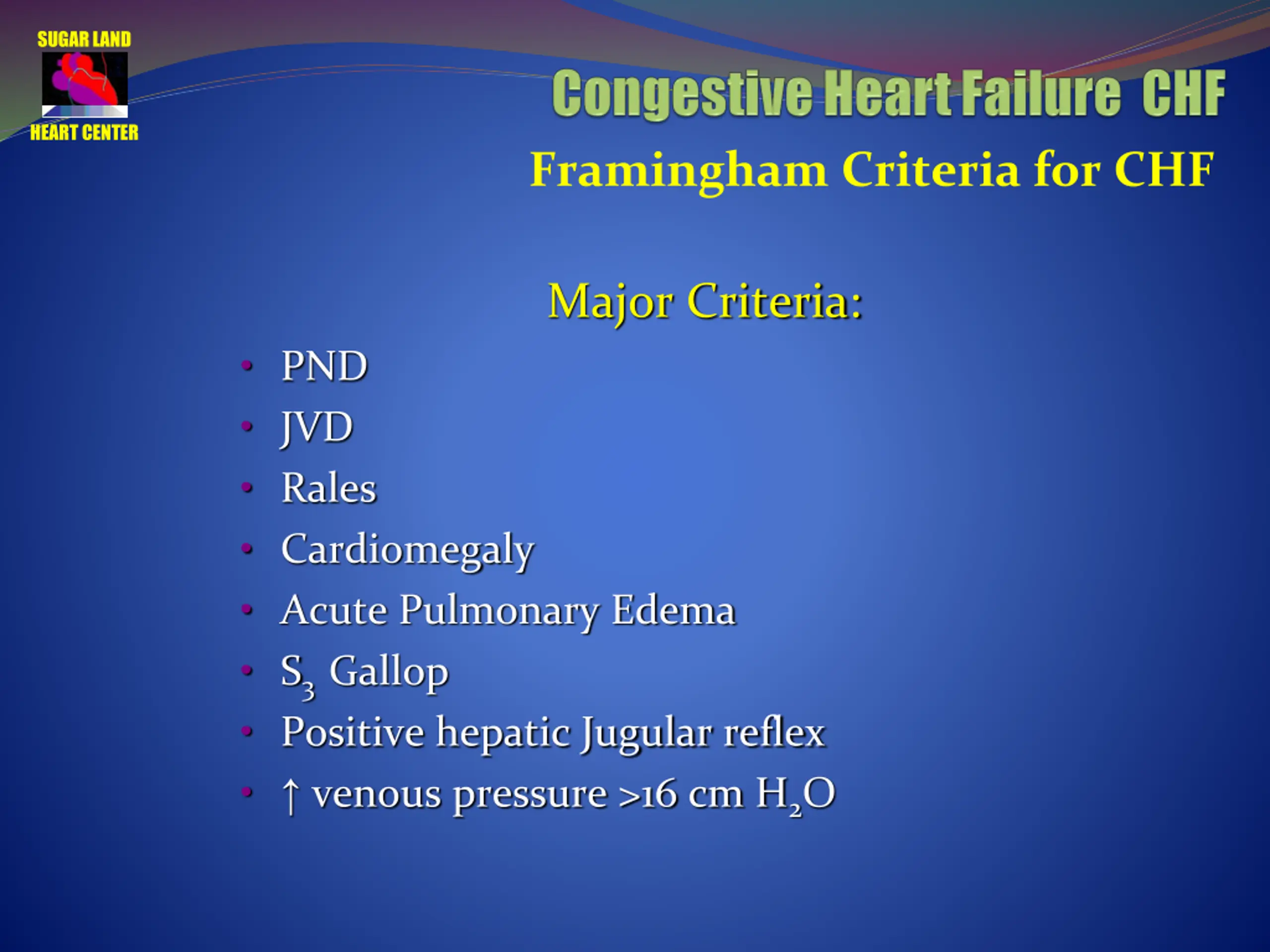 SUGAR LAND HEART CENTER Framingham Criteria for CHF Major Criteria: PND JVD Rales Cardiomegaly Acute Pulmonary Edema S3 Gallop Positive hepatic Jugular reflex venous pressure >16 cm H2O