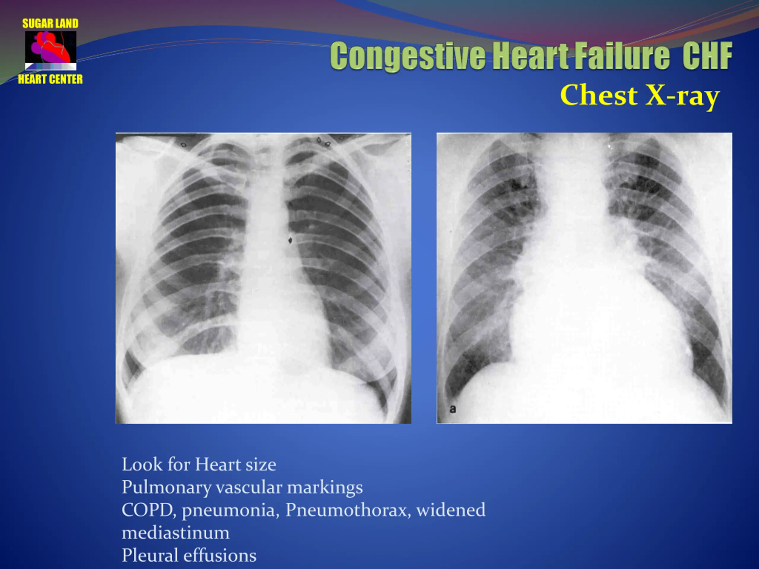 SUGAR LAND HEART CENTER Chest X-ray Look for Heart size Pulmonary vascular markings COPD, pneumonia, Pneumothorax, widened mediastinum Pleural effusions