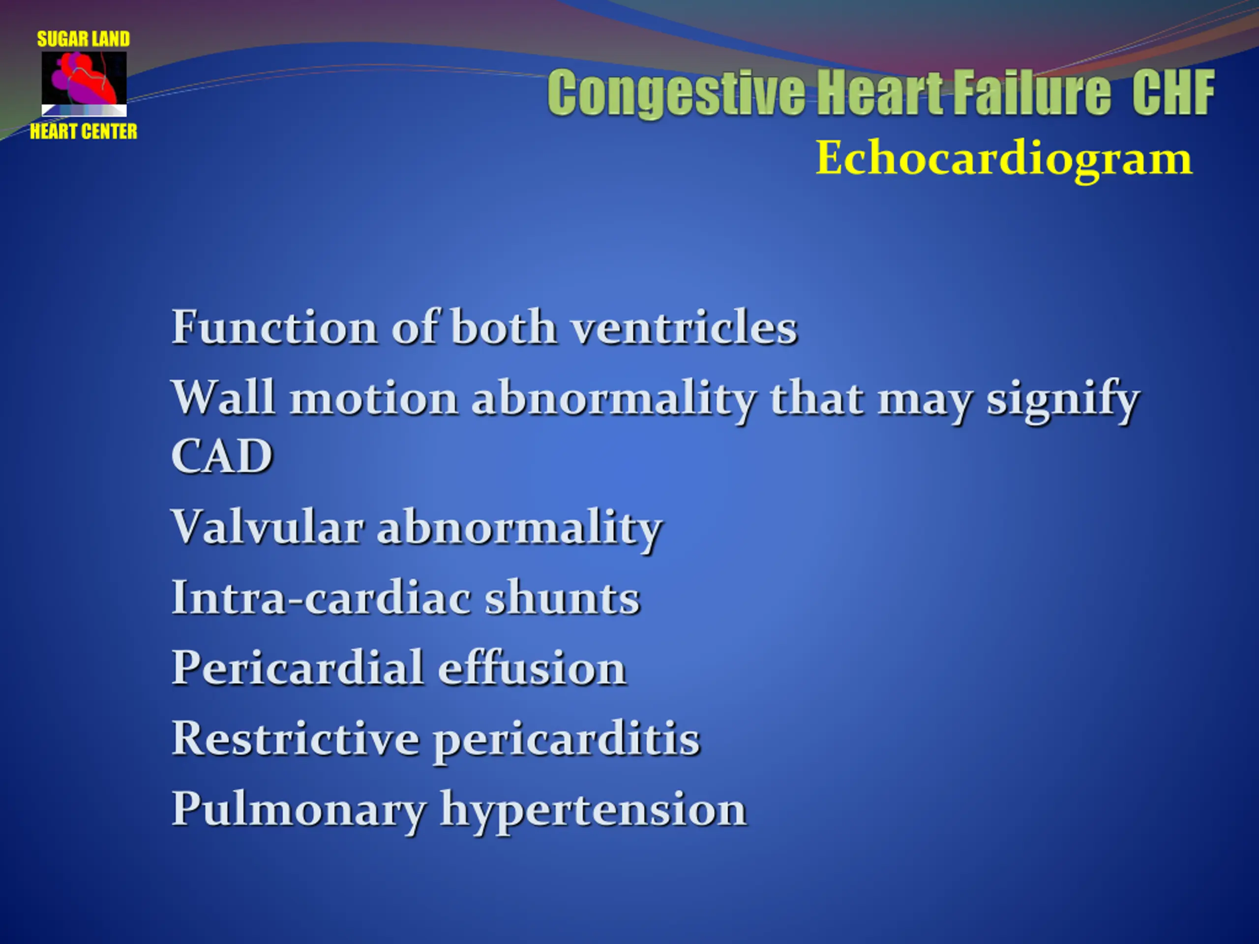 SUGAR LAND HEART CENTER Echocardiogram Function of both ventricles Wall motion abnormality that may signify CAD Valvular abnormality Intra-cardiac shunts Pericardial effusion Restrictive pericarditis Pulmonary hypertension
