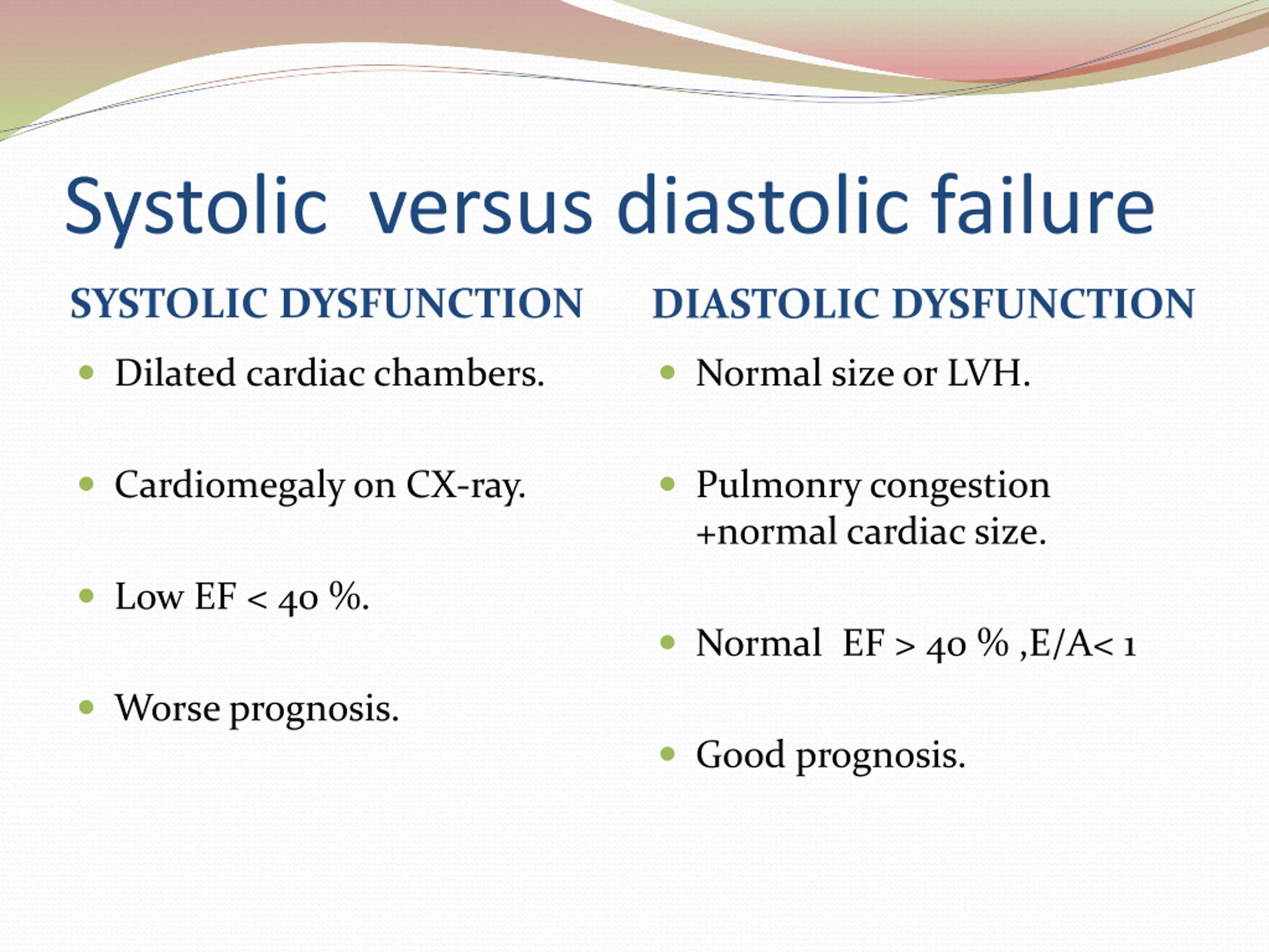 Systolic versus diastolic failure SYSTOLIC DYSFUNCTION DIASTOLIC DYSFUNCTION Dilated cardiac chambers. Normal size or LVH. Cardiomegaly on CX-ray. Pulmonry congestion +normal cardiac size. Low EF < 40 %. Normal EF > 40 % ,E/A< 1 Worse prognosis. Good prognosis.