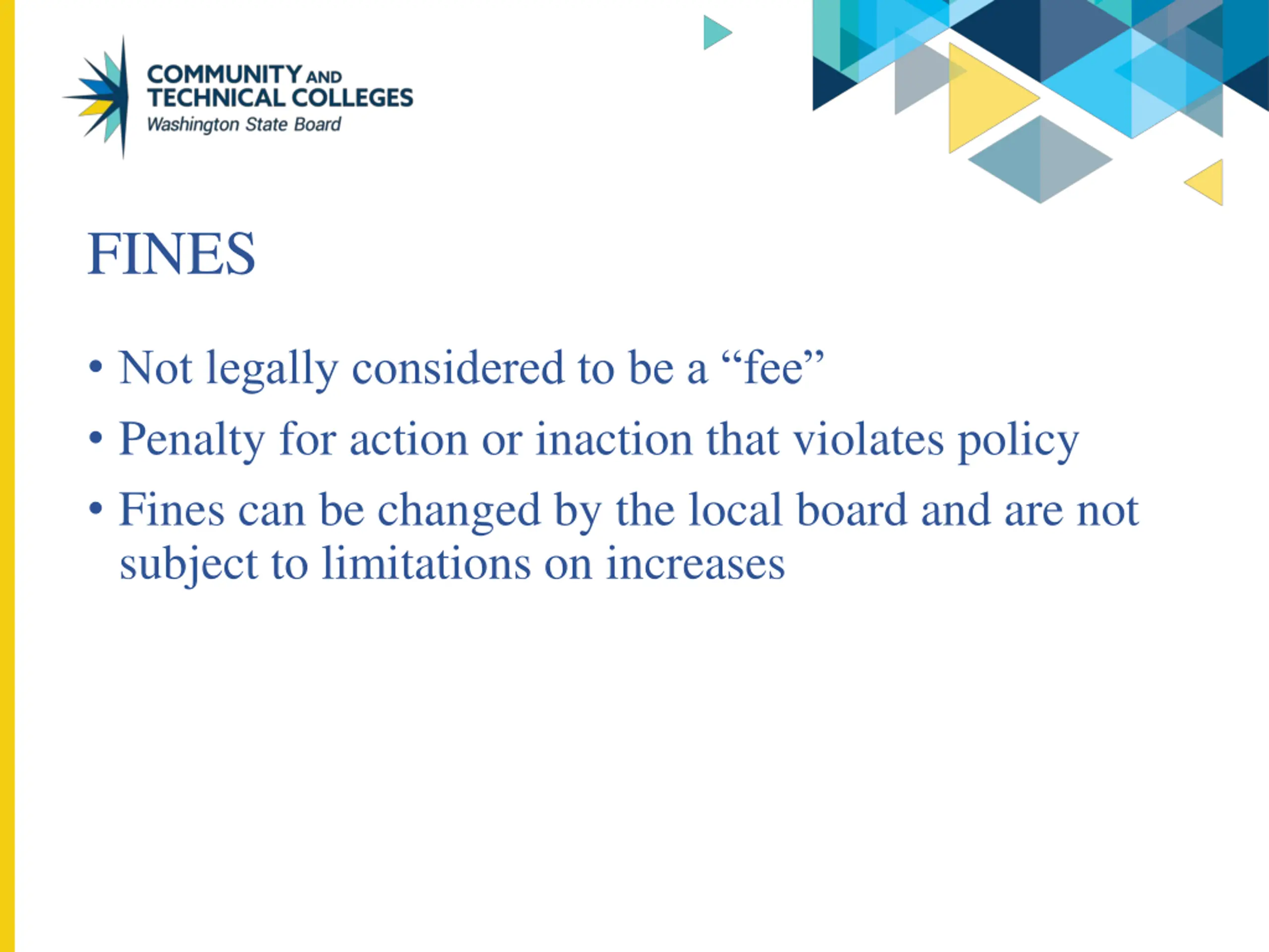 FINES Not legally considered to be a fee Penalty for action or inaction that violates policy Fines can be changed by the local board and are not subject to limitations on increases