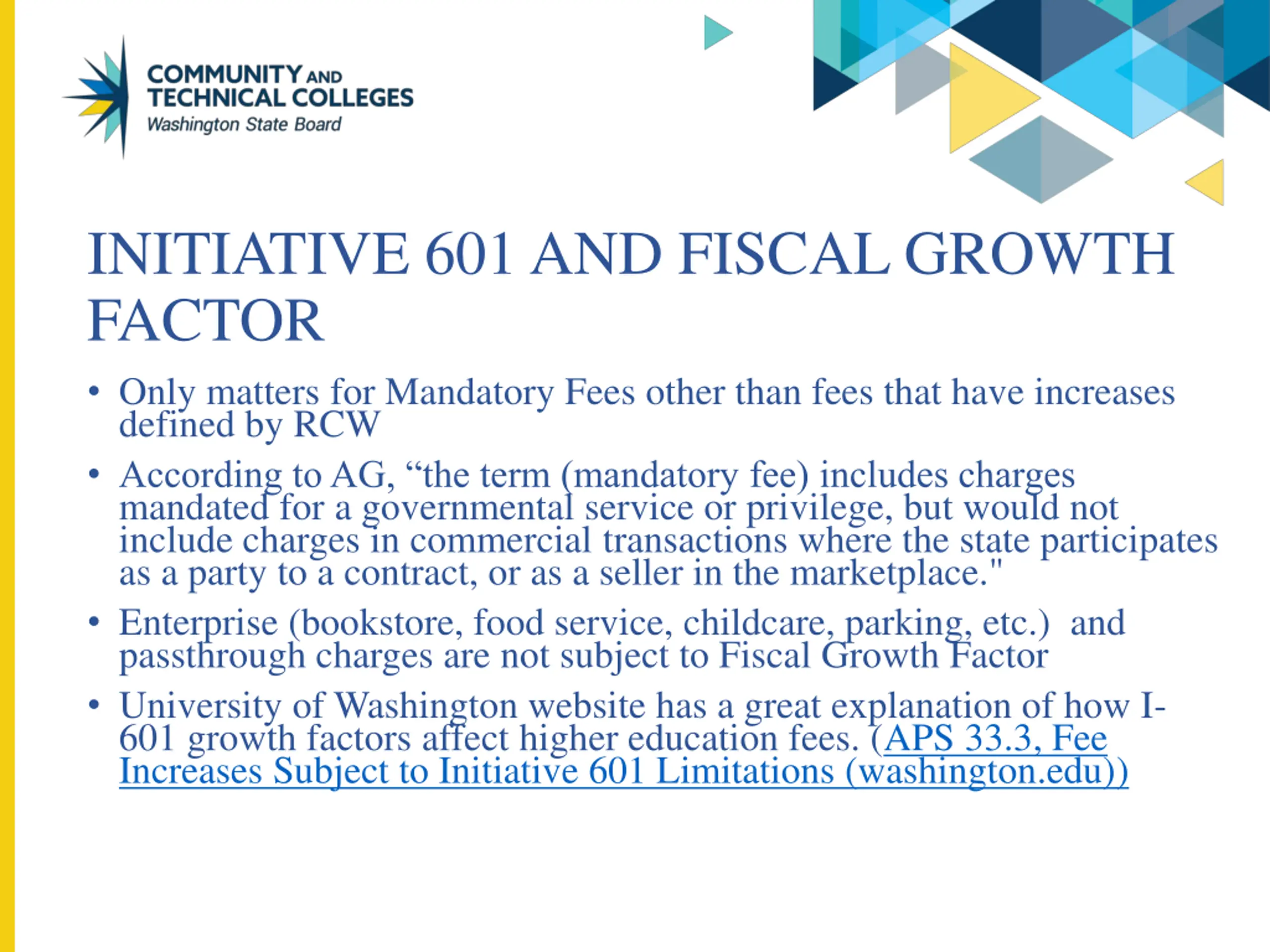INITIATIVE 601 AND FISCAL GROWTH FACTOR Only matters for Mandatory Fees other than fees that have increases defined by RCW According to AG, the term (mandatory fee) includes charges mandated for a governmental service or privilege, but would not include charges in commercial transactions where the state participates as a party to a contract, or as a seller in the marketplace." Enterprise (bookstore, food service, childcare, parking, etc.) and passthrough charges are not subject to Fiscal Growth Factor University of Washington website has a great explanation of how I- 601 growth factors affect higher education fees. (APS 33.3, Fee Increases Subject to Initiative 601 Limitations (washington.edu))