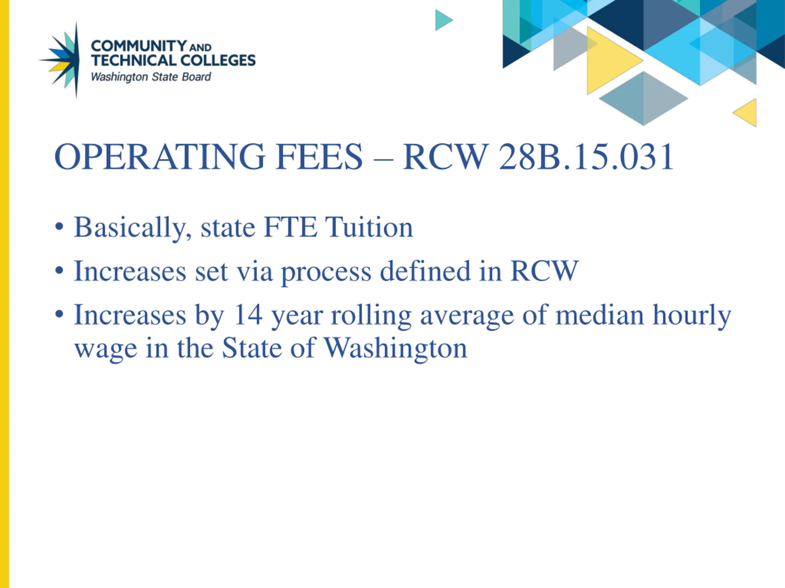 OPERATING FEES RCW 28B.15.031 Basically, state FTE Tuition Increases set via process defined in RCW Increases by 14 year rolling average of median hourly wage in the State of Washington