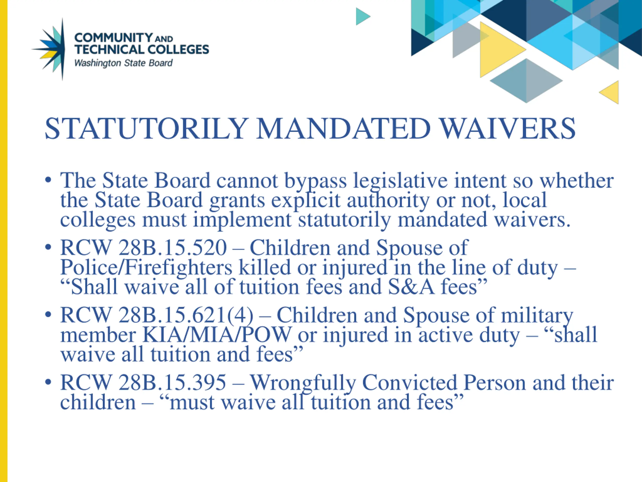 STATUTORILY MANDATED WAIVERS The State Board cannot bypass legislative intent so whether the State Board grants explicit authority or not, local colleges must implement statutorily mandated waivers. RCW 28B.15.520 Children and Spouse of Police/Firefighters killed or injured in the line of duty Shall waive all of tuition fees and S&A fees RCW 28B.15.621(4) Children and Spouse of military member KIA/MIA/POW or injured in active duty shall waive all tuition and fees RCW 28B.15.395 Wrongfully Convicted Person and their children must waive all tuition and fees