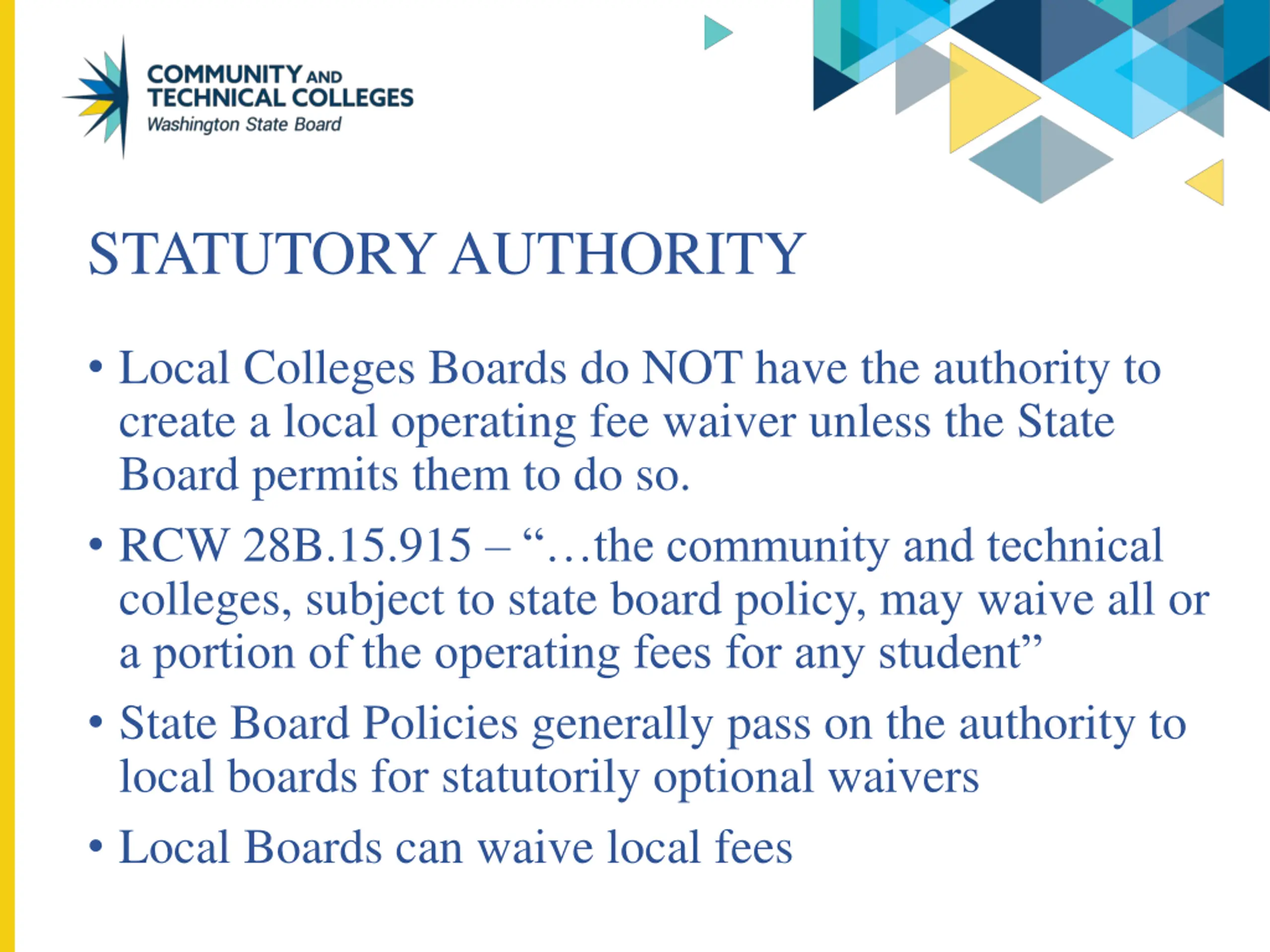 STATUTORY AUTHORITY Local Colleges Boards do NOT have the authority to create a local operating fee waiver unless the State Board permits them to do so. RCW 28B.15.915 the community and technical colleges, subject to state board policy, may waive all or a portion of the operating fees for any student State Board Policies generally pass on the authority to local boards for statutorily optional waivers Local Boards can waive local fees