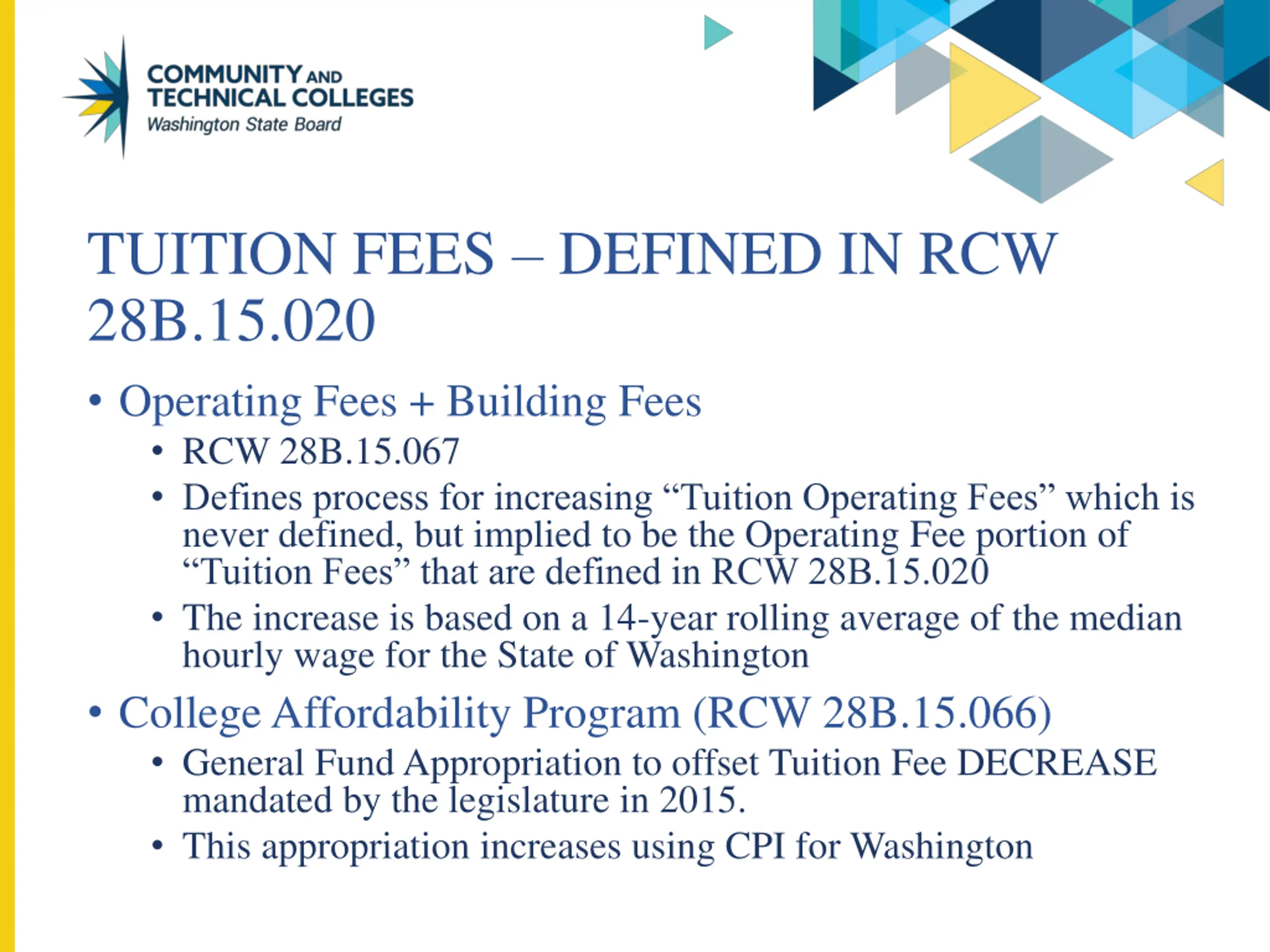 TUITION FEES DEFINED IN RCW 28B.15.020 Operating Fees + Building Fees RCW 28B.15.067 Defines process for increasing Tuition Operating Fees which is never defined, but implied to be the Operating Fee portion of Tuition Fees that are defined in RCW 28B.15.020 The increase is based on a 14-year rolling average of the median hourly wage for the State of Washington College Affordability Program (RCW 28B.15.066) General Fund Appropriation to offset Tuition Fee DECREASE mandated by the legislature in 2015. This appropriation increases using CPI for Washington