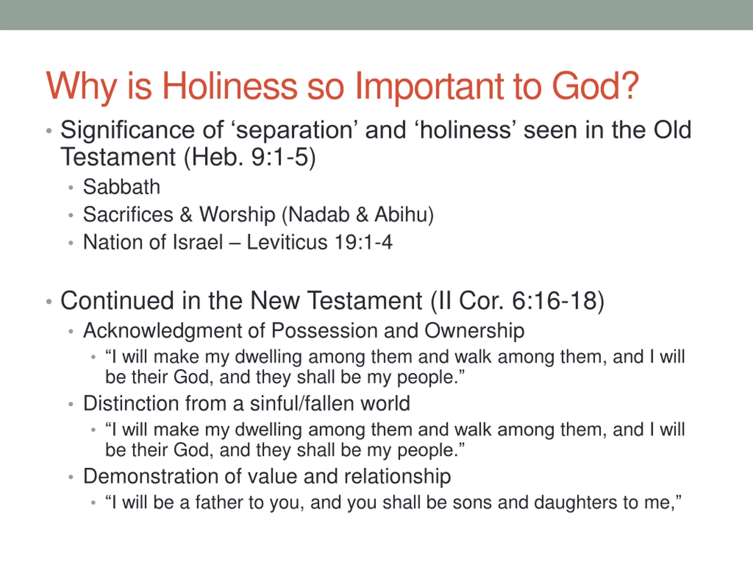 Why is Holiness so Important to God? Significance of separation and holiness seen in the Old Testament (Heb. 9:1-5) Sabbath Sacrifices & Worship (Nadab & Abihu) Nation of Israel Leviticus 19:1-4 Continued in the New Testament (II Cor. 6:16-18) Acknowledgment of Possession and Ownership I will make my dwelling among them and walk among them, and I will be their God, and they shall be my people. Distinction from a sinful/fallen world I will make my dwelling among them and walk among them, and I will be their God, and they shall be my people. Demonstration of value and relationship I will be a father to you, and you shall be sons and daughters to me,