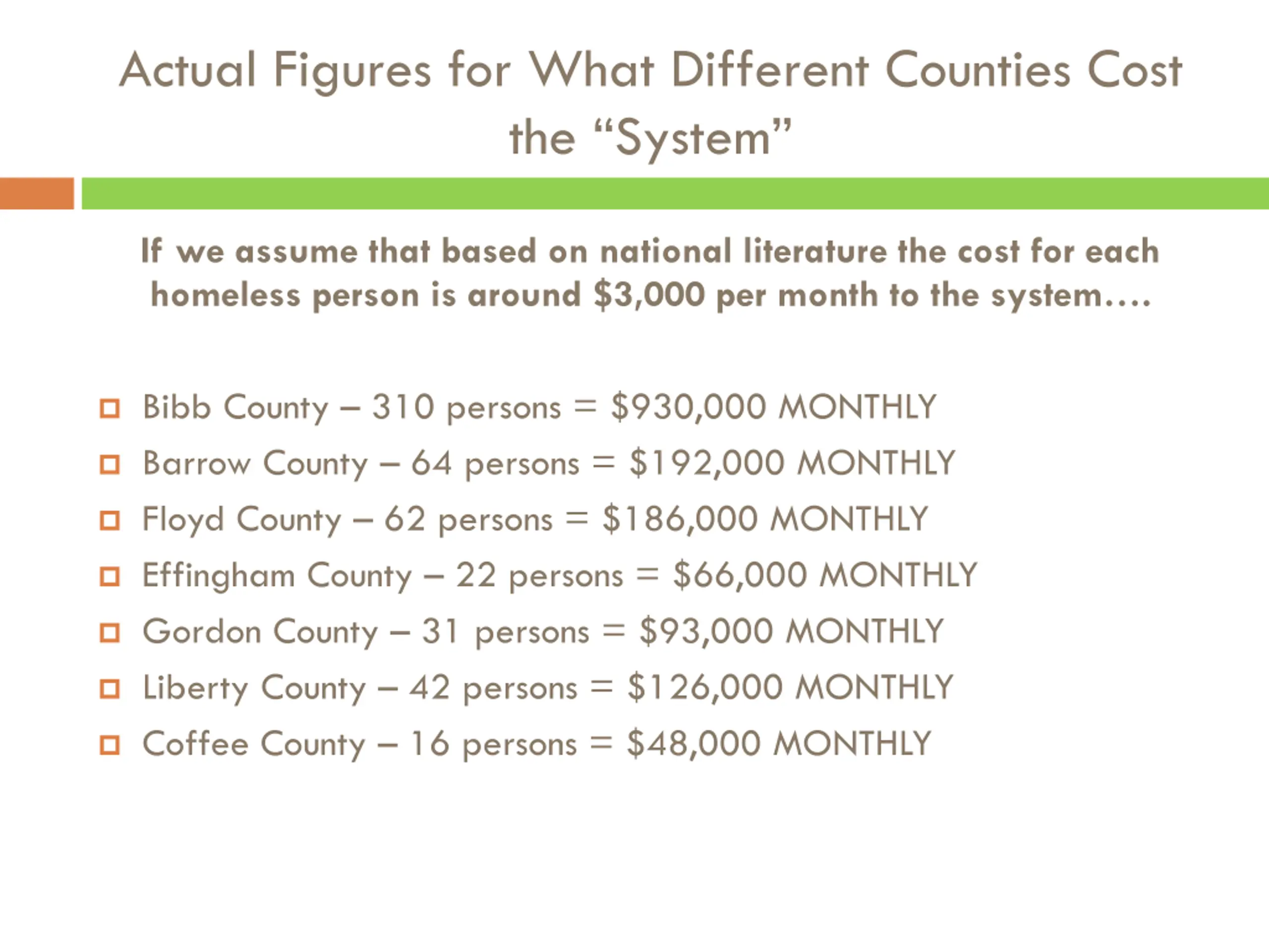 Actual Figures for What Different Counties Cost the System If we assume that based on national literature the cost for each homeless person is around $3,000 per month to the system . Bibb County 310 persons = $930,000 MONTHLY Barrow County 64 persons = $192,000 MONTHLY Floyd County 62 persons = $186,000 MONTHLY Effingham County 22 persons = $66,000 MONTHLY Gordon County 31 persons = $93,000 MONTHLY Liberty County 42 persons = $126,000 MONTHLY Coffee County 16 persons = $48,000 MONTHLY