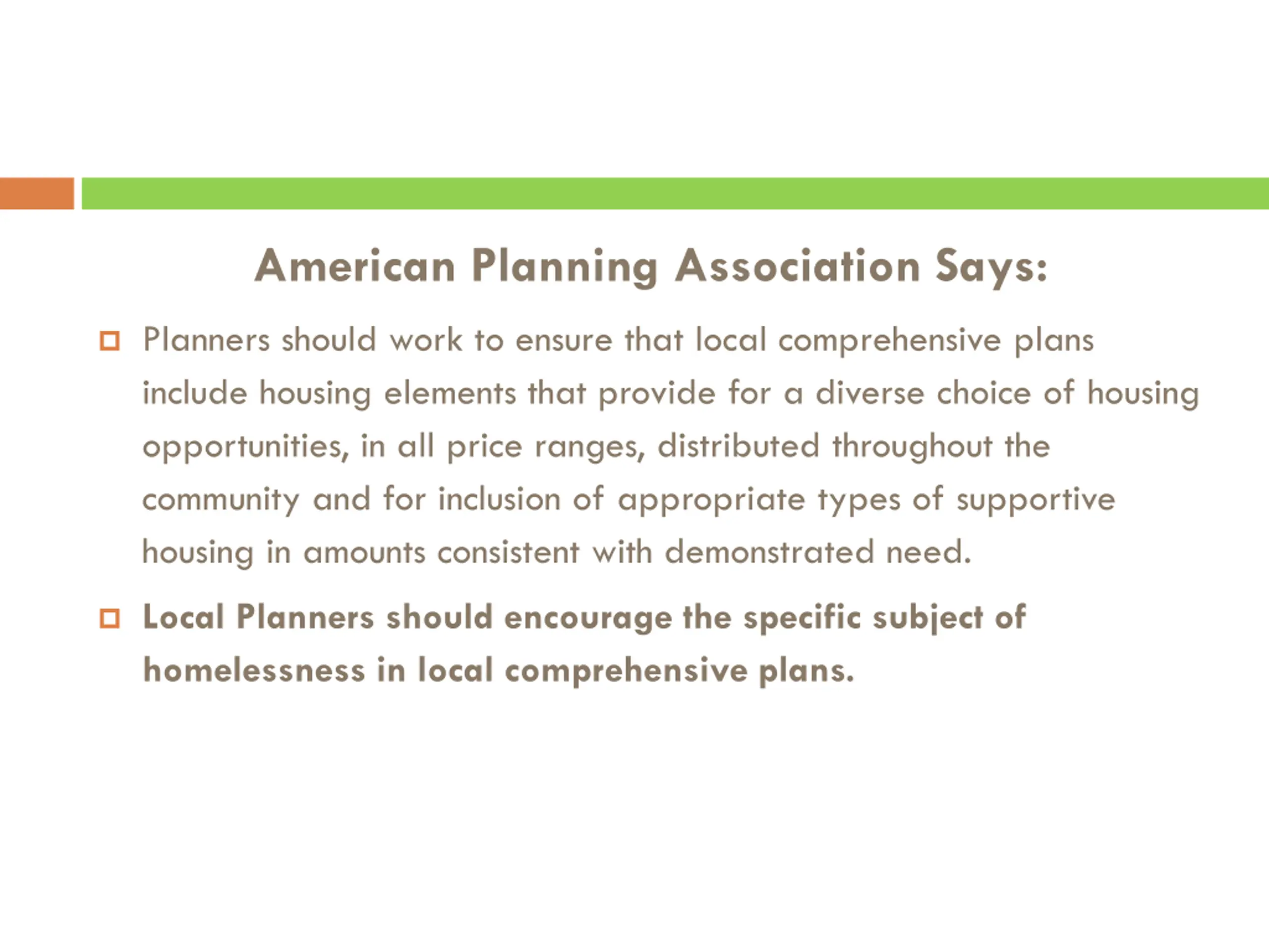 American Planning Association Says: Planners should work to ensure that local comprehensive plans include housing elements that provide for a diverse choice of housing opportunities, in all price ranges, distributed throughout the community and for inclusion of appropriate types of supportive housing in amounts consistent with demonstrated need. Local Planners should encourage the specific subject of homelessness in local comprehensive plans.
