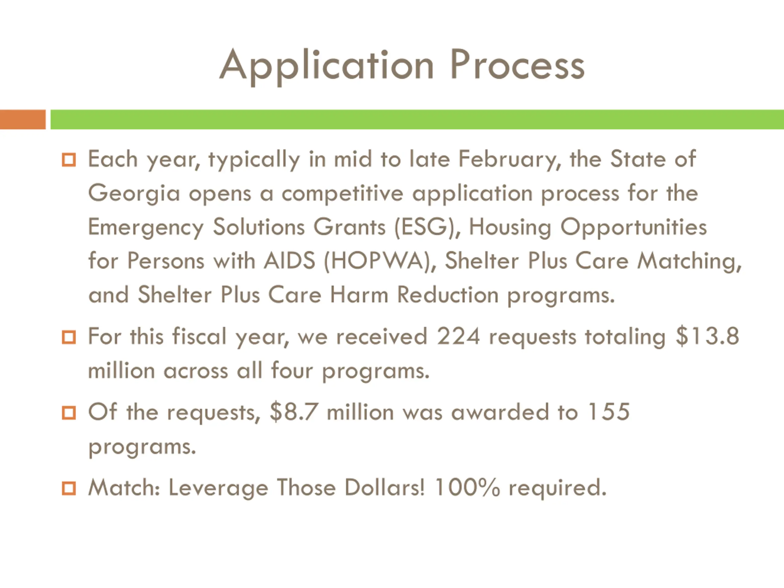 Application Process Each year, typically in mid to late February, the State of Georgia opens a competitive application process for the Emergency Solutions Grants (ESG), Housing Opportunities for Persons with AIDS (HOPWA), Shelter Plus Care Matching, and Shelter Plus Care Harm Reduction programs. For this fiscal year, we received 224 requests totaling $13.8 million across all four programs. Of the requests, $8.7 million was awarded to 155 programs. Match: Leverage Those Dollars! 100% required.
