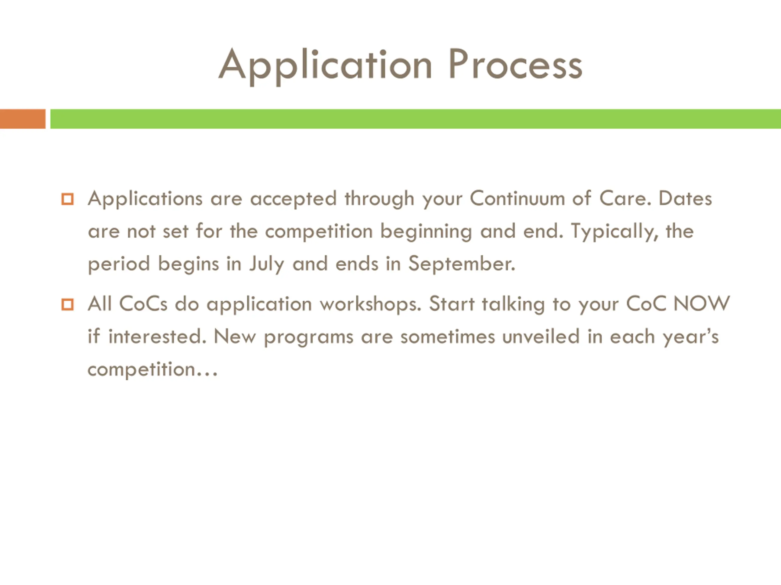 Application Process Applications are accepted through your Continuum of Care. Dates are not set for the competition beginning and end. Typically, the period begins in July and ends in September. All CoCs do application workshops. Start talking to your CoC NOW if interested. New programs are sometimes unveiled in each year s competition
