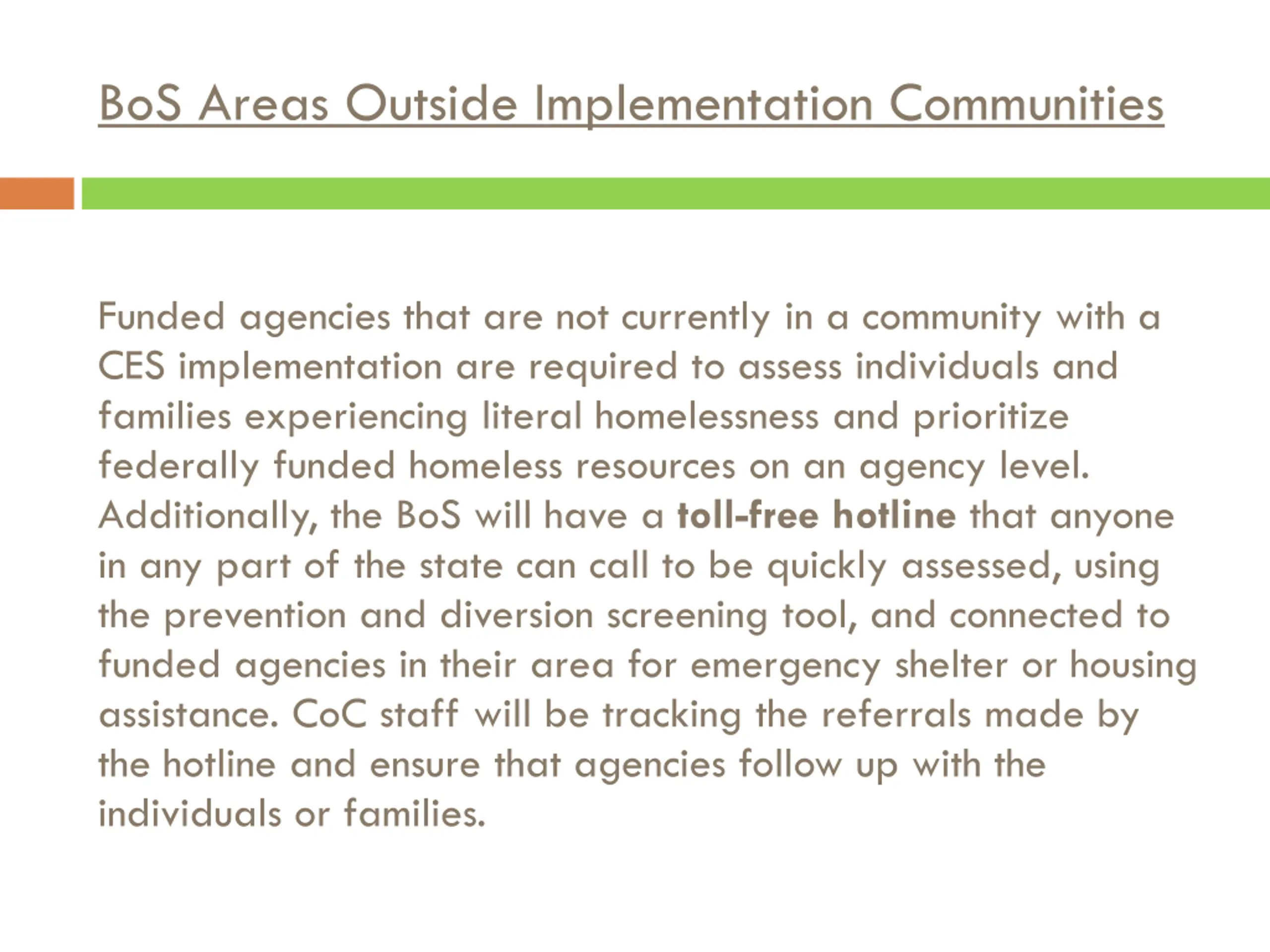 BoS Areas Outside Implementation Communities Funded agencies that are not currently in a community with a CES implementation are required to assess individuals and families experiencing literal homelessness and prioritize federally funded homeless resources on an agency level. Additionally, the BoS will have a toll-free hotline that anyone in any part of the state can call to be quickly assessed, using the prevention and diversion screening tool, and connected to funded agencies in their area for emergency shelter or housing assistance. CoC staff will be tracking the referrals made by the hotline and ensure that agencies follow up with the individuals or families.
