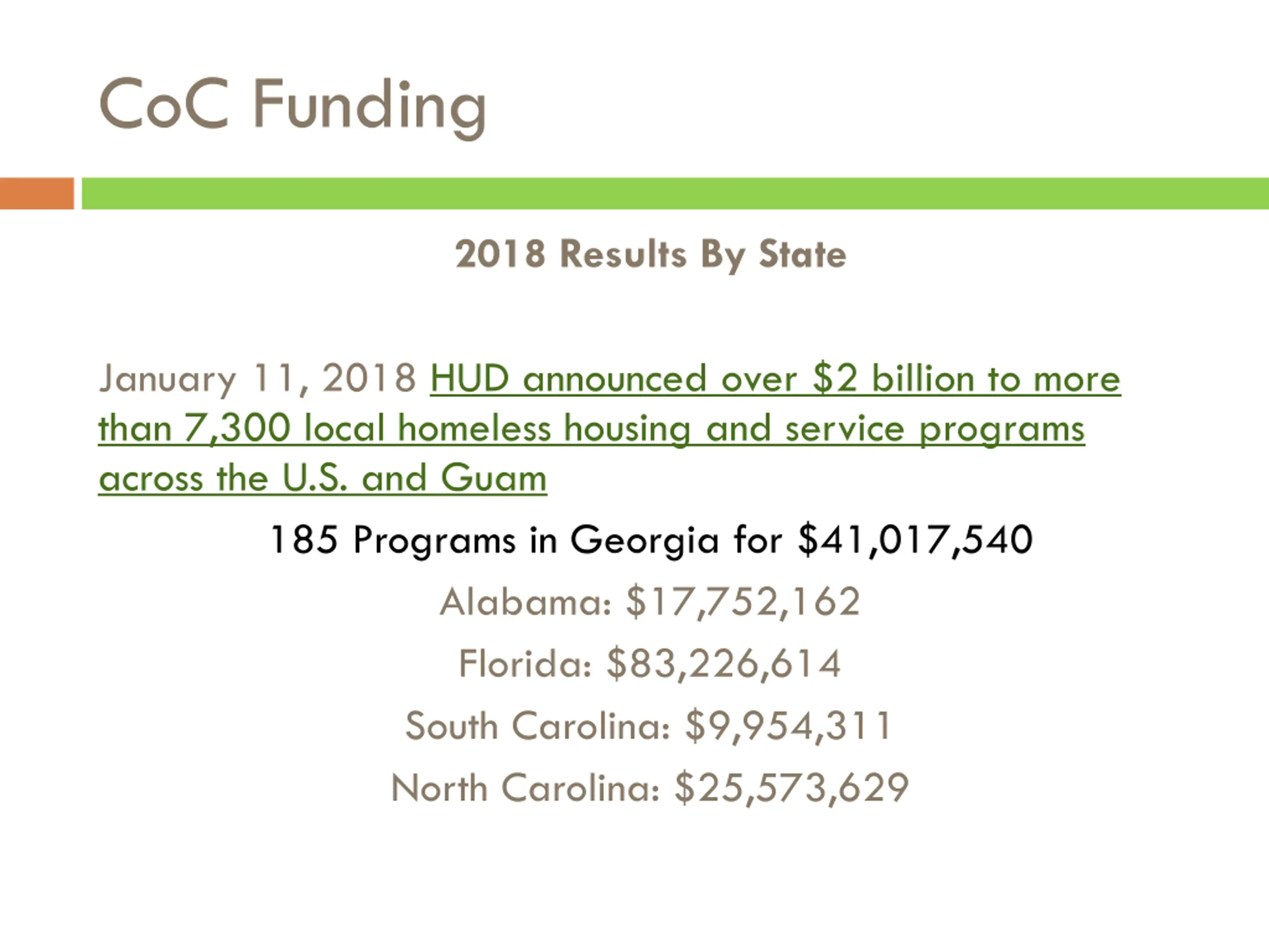 CoC Funding 2018 Results By State January 11, 2018 HUD announced over $2 billion to more than 7,300 local homeless housing and service programs across the U.S. and Guam 185 Programs in Georgia for $41,017,540 Alabama: $17,752,162 Florida: $83,226,614 South Carolina: $9,954,311 North Carolina: $25,573,629