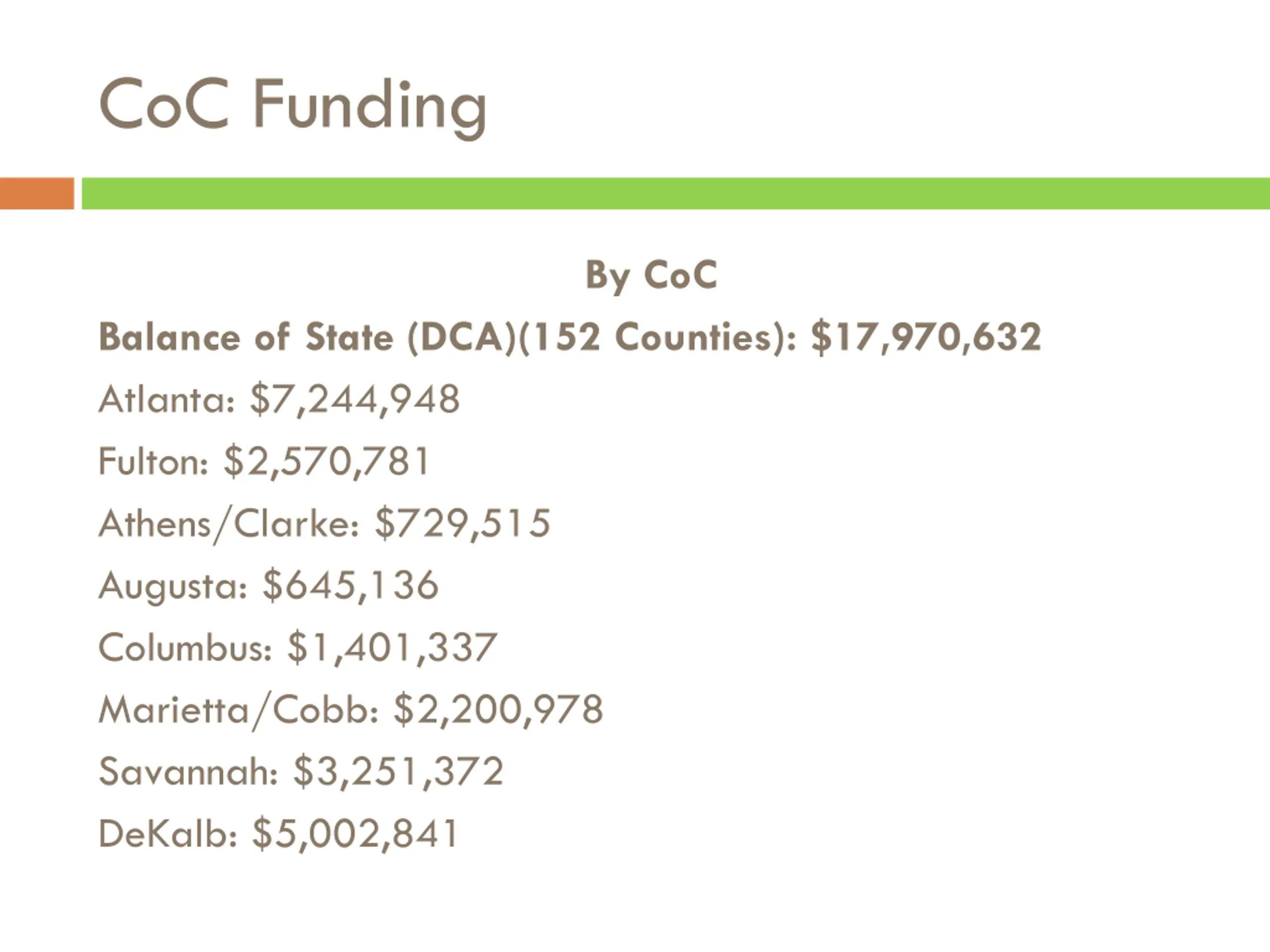 CoC Funding By CoC Balance of State (DCA)(152 Counties): $17,970,632 Atlanta: $7,244,948 Fulton: $2,570,781 Athens/Clarke: $729,515 Augusta: $645,136 Columbus: $1,401,337 Marietta/Cobb: $2,200,978 Savannah: $3,251,372 DeKalb: $5,002,841