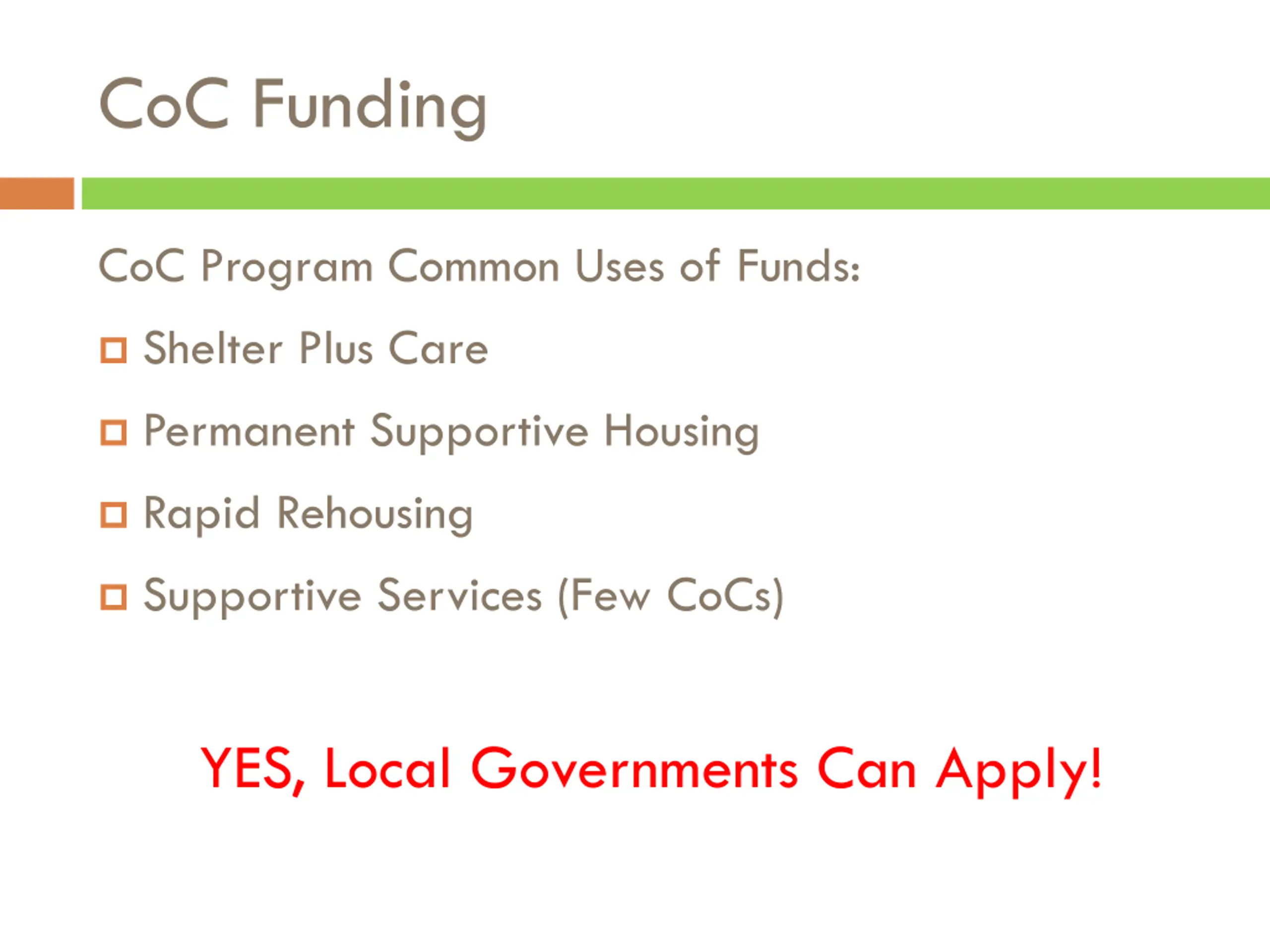 CoC Funding CoC Program Common Uses of Funds: Shelter Plus Care Permanent Supportive Housing Rapid Rehousing Supportive Services (Few CoCs) YES, Local Governments Can Apply!