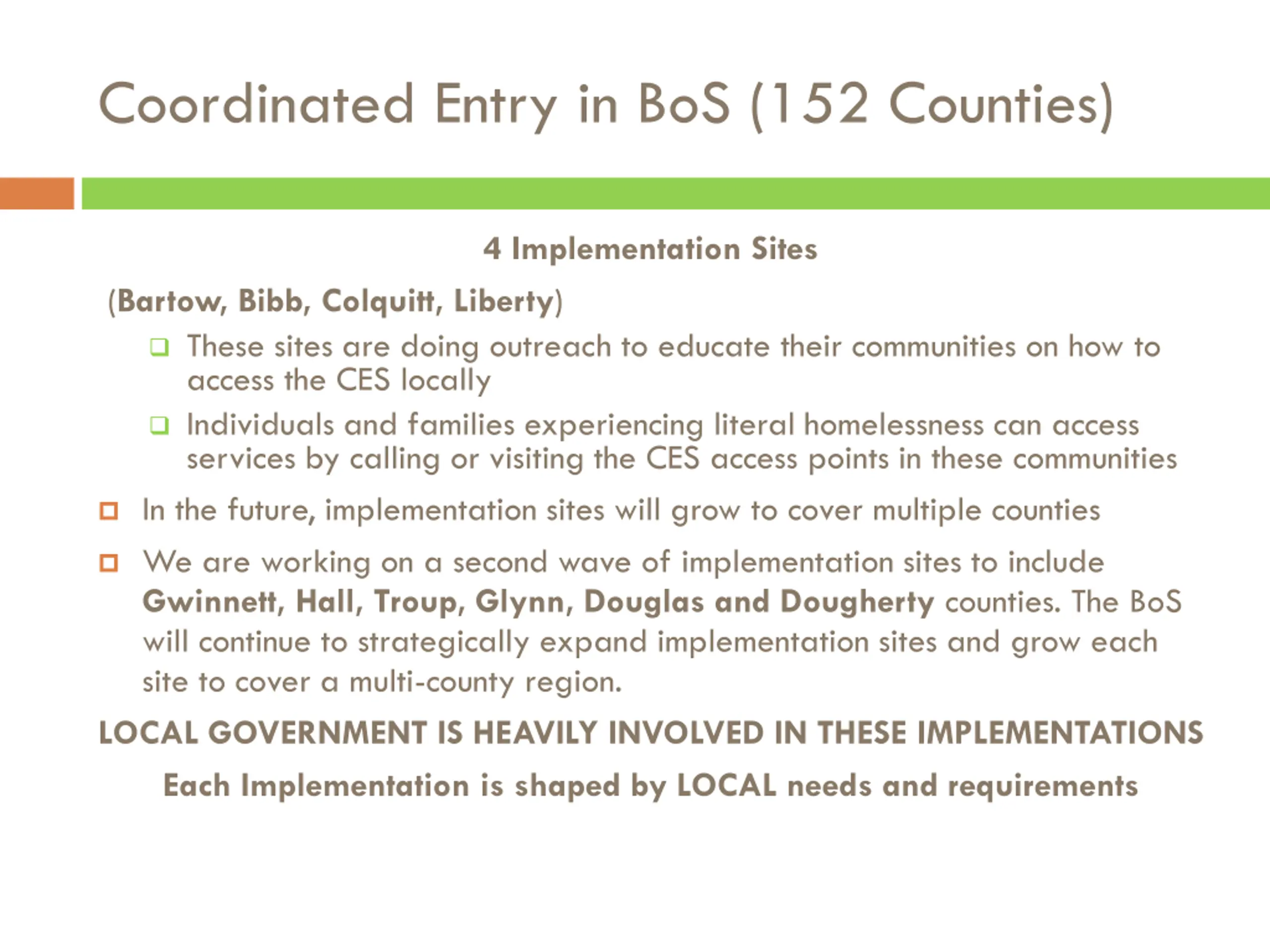 Coordinated Entry in BoS (152 Counties) 4 Implementation Sites (Bartow, Bibb, Colquitt, Liberty) These sites are doing outreach to educate their communities on how to access the CES locally Individuals and families experiencing literal homelessness can access services by calling or visiting the CES access points in these communities In the future, implementation sites will grow to cover multiple counties We are working on a second wave of implementation sites to include Gwinnett, Hall, Troup, Glynn, Douglas and Dougherty counties. The BoS will continue to strategically expand implementation sites and grow each site to cover a multi-county region. LOCAL GOVERNMENT IS HEAVILY INVOLVED IN THESE IMPLEMENTATIONS Each Implementation is shaped by LOCAL needs and requirements