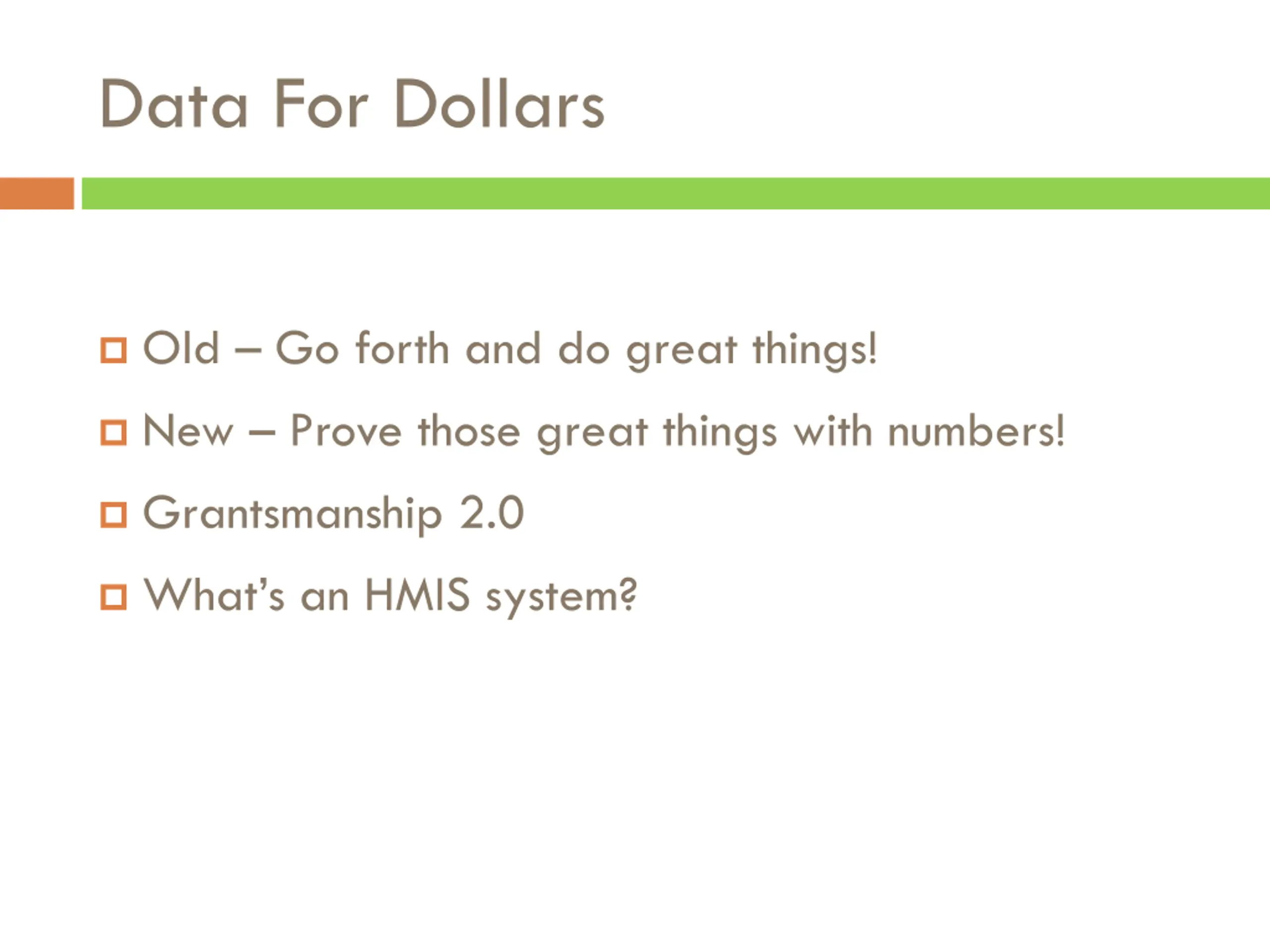 Data For Dollars Old Go forth and do great things! New Prove those great things with numbers! Grantsmanship 2.0 What s an HMIS system?