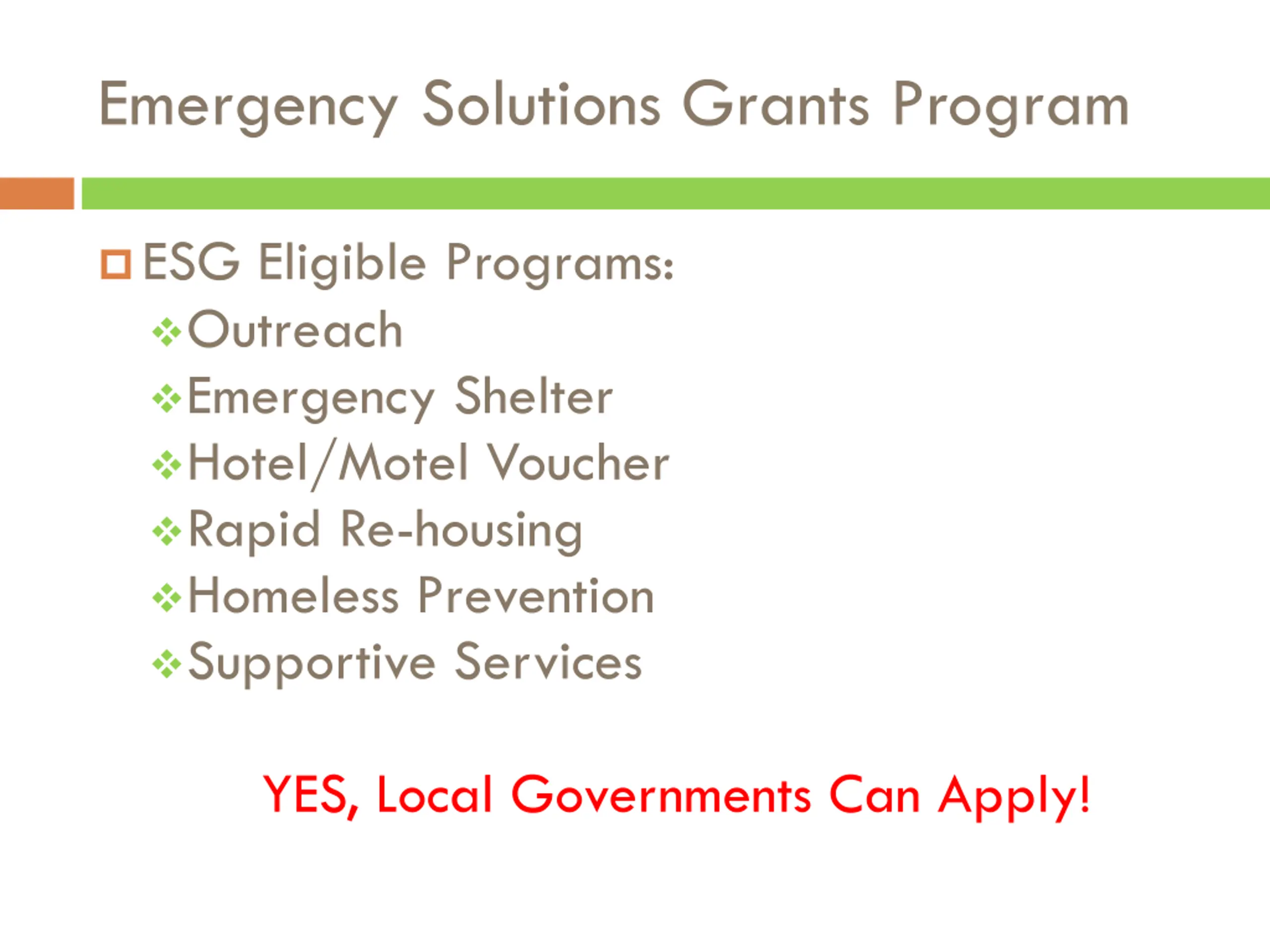 Emergency Solutions Grants Program ESG Eligible Programs: Outreach Emergency Shelter Hotel/Motel Voucher Rapid Re-housing Homeless Prevention Supportive Services YES, Local Governments Can Apply!