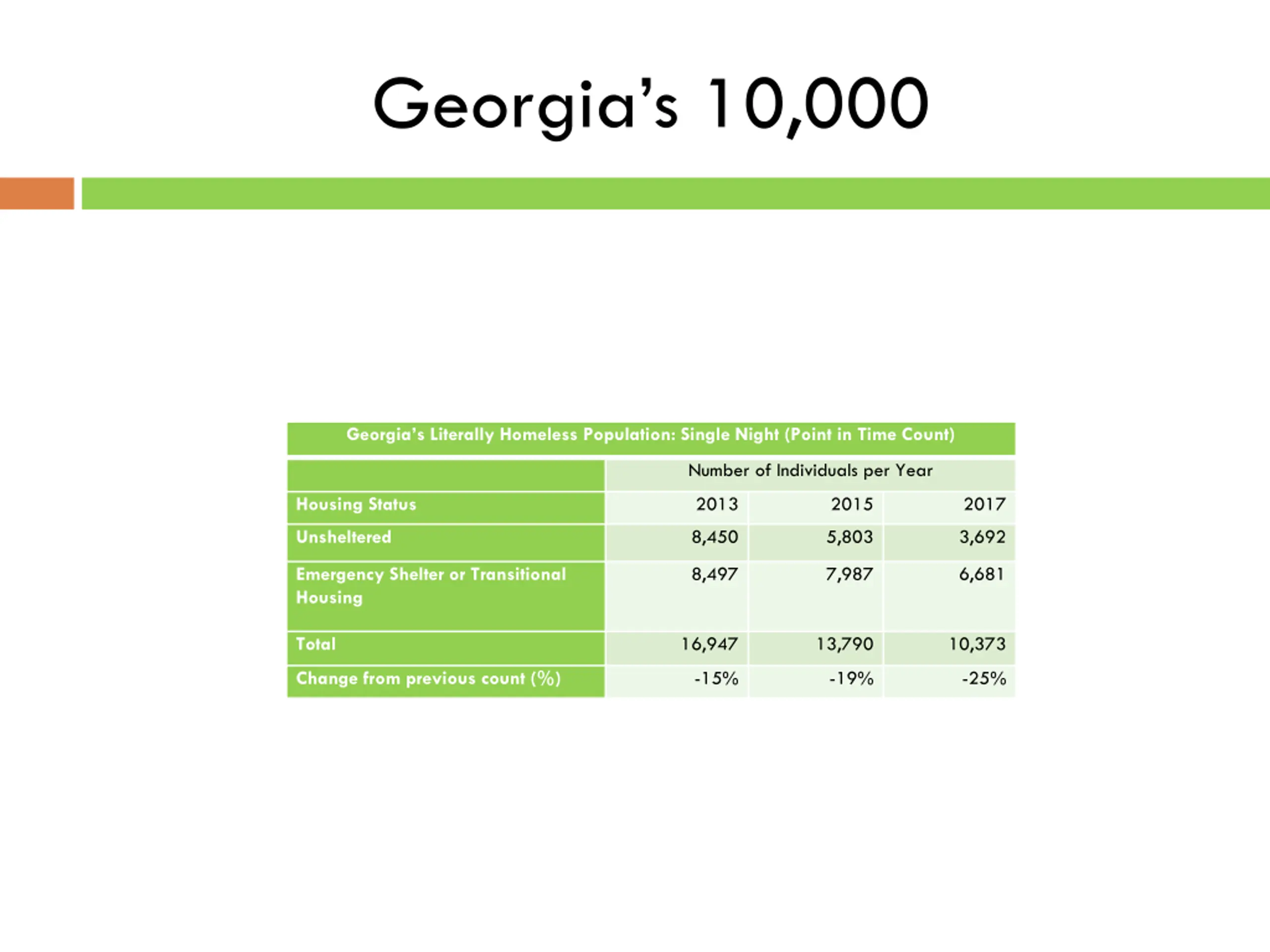 Georgias 10,000 Georgia s Literally Homeless Population: Single Night (Point in Time Count) Number of Individuals per Year Housing Status 2013 2015 2017 Unsheltered 8,450 5,803 3,692 Emergency Shelter or Transitional Housing 8,497 7,987 6,681 Total 16,947 13,790 10,373 Change from previous count (%) -15% -19% -25%