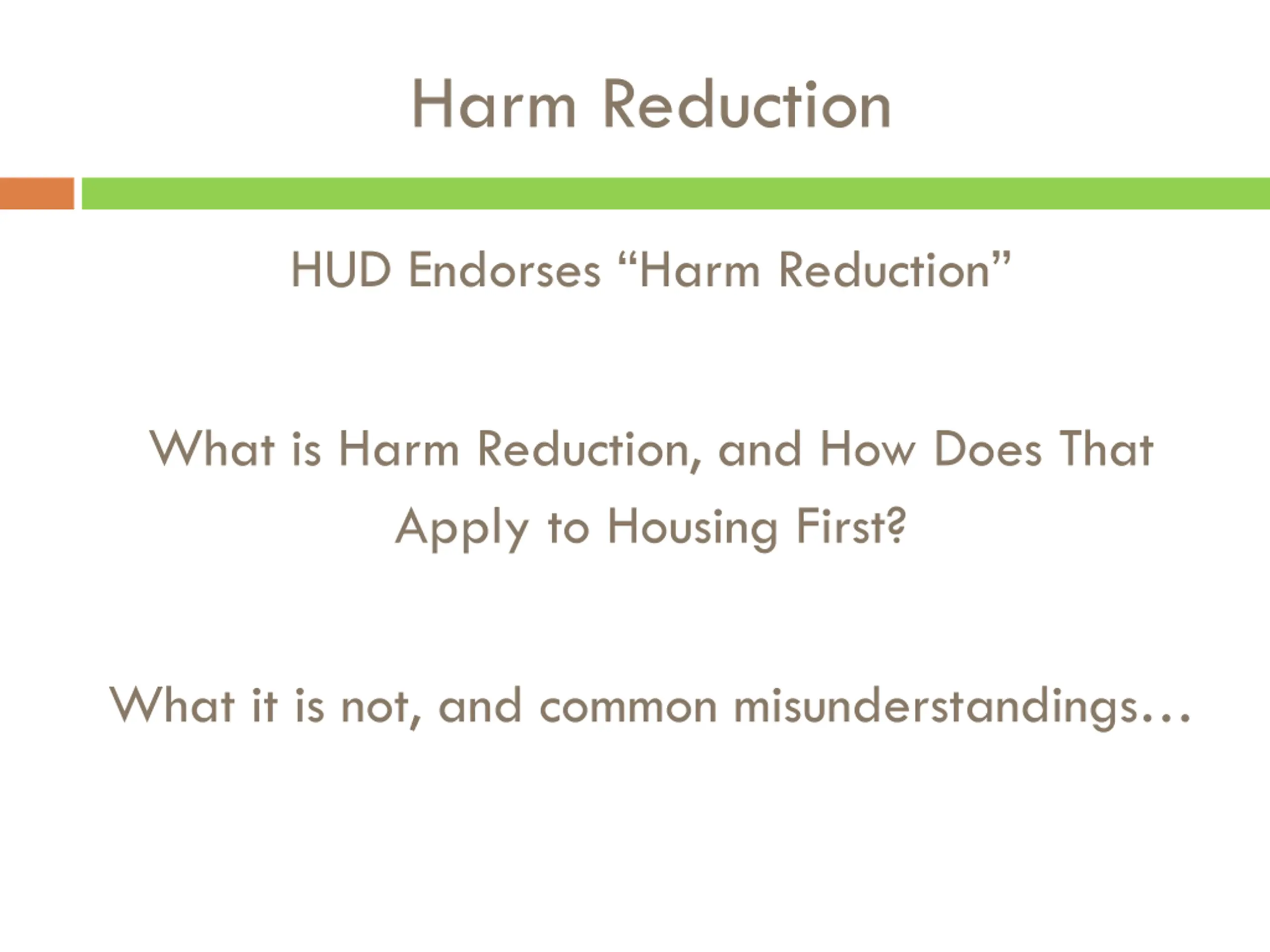 Harm Reduction HUD Endorses Harm Reduction What is Harm Reduction, and How Does That Apply to Housing First? What it is not, and common misunderstandings