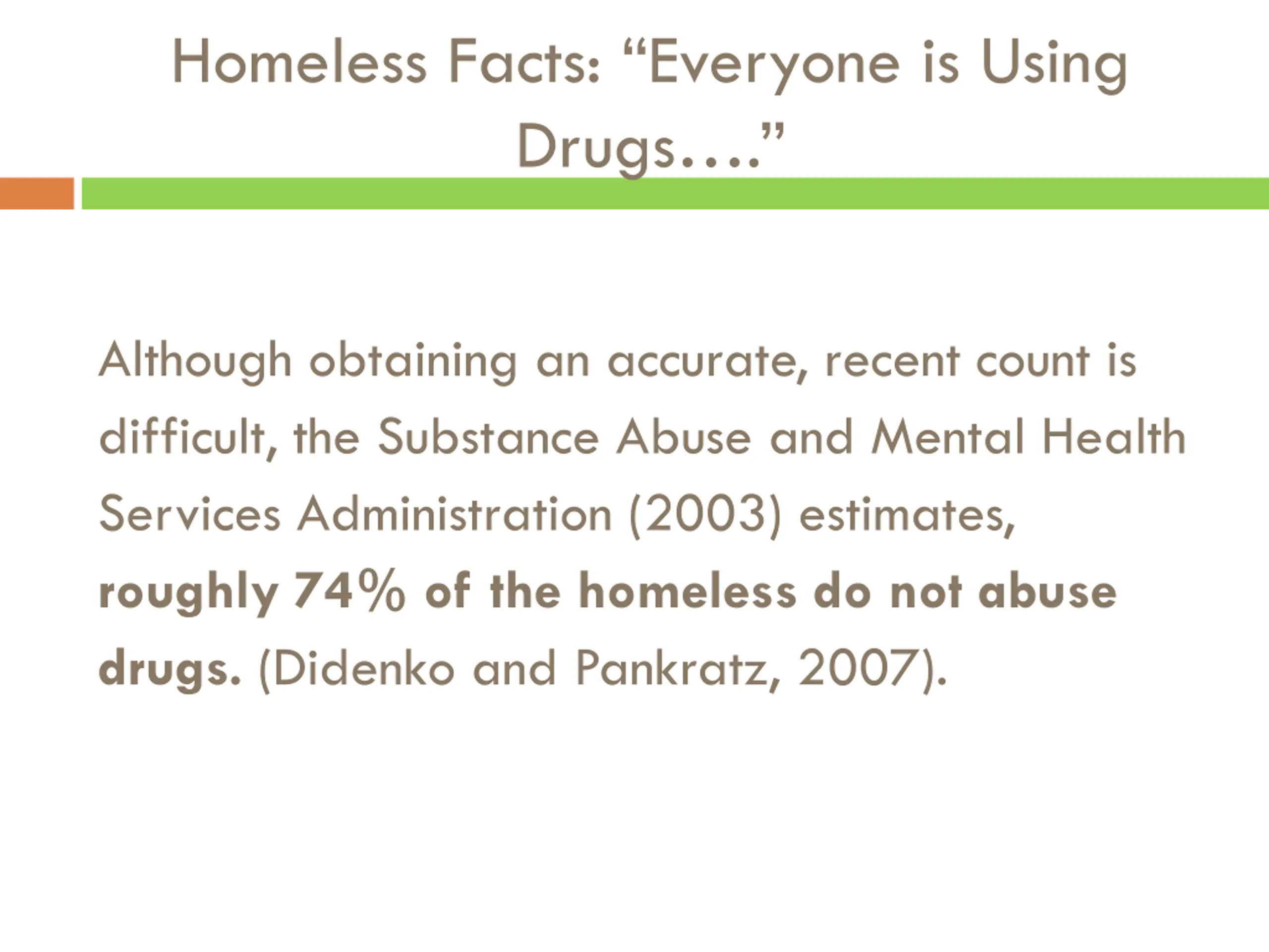 Homeless Facts: Everyone is Using Drugs . Although obtaining an accurate, recent count is difficult, the Substance Abuse and Mental Health Services Administration (2003) estimates, roughly 74% of the homeless do not abuse drugs. (Didenko and Pankratz, 2007).