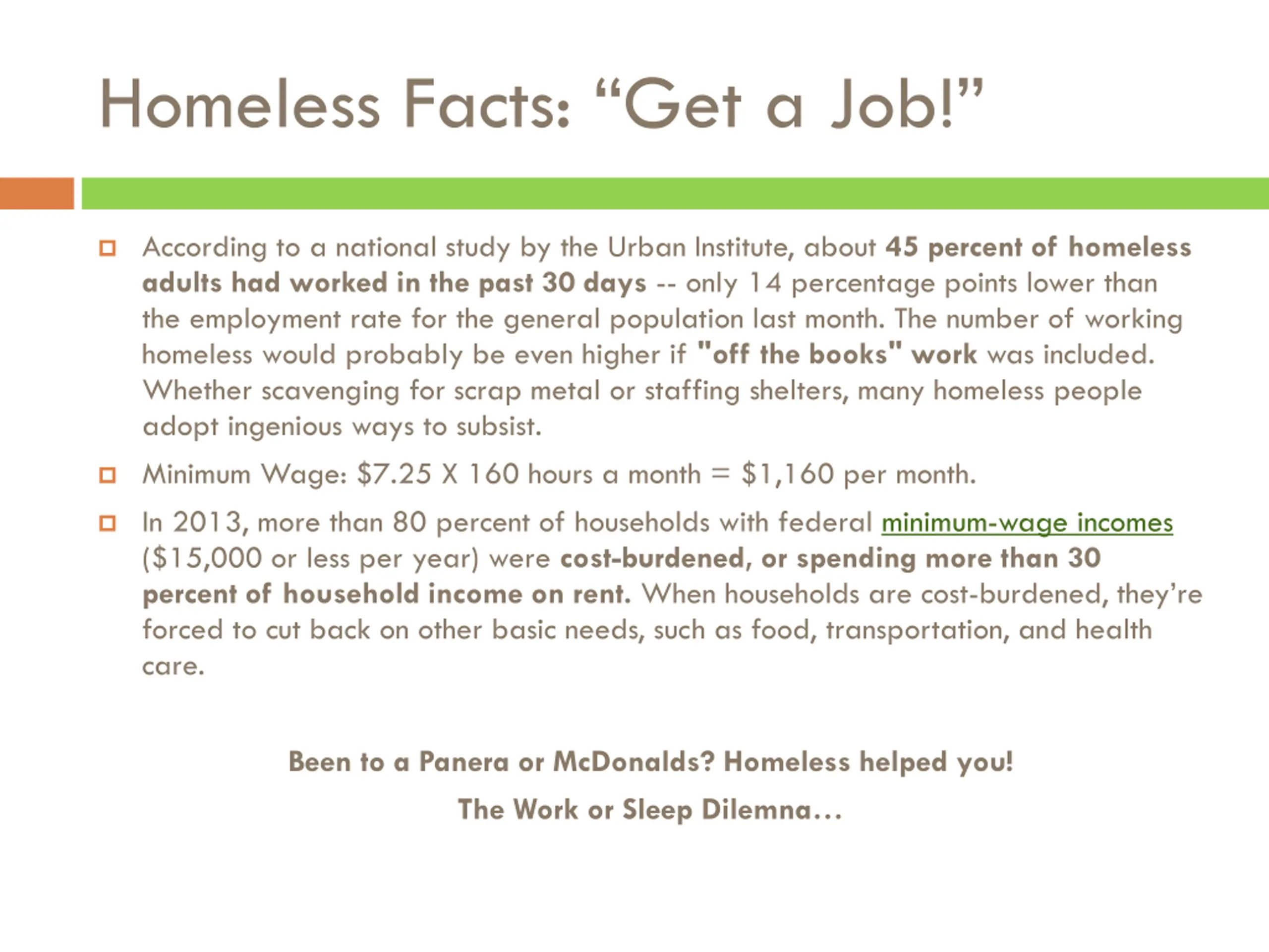 Homeless Facts: Get a Job! According to a national study by the Urban Institute, about 45 percent of homeless adults had worked in the past 30 days -- only 14 percentage points lower than the employment rate for the general population last month. The number of working homeless would probably be even higher if "off the books" work was included. Whether scavenging for scrap metal or staffing shelters, many homeless people adopt ingenious ways to subsist. Minimum Wage: $7.25 X 160 hours a month = $1,160 per month. In 2013, more than 80 percent of households with federal minimum-wage incomes ($15,000 or less per year) were cost-burdened, or spending more than 30 percent of household income on rent. When households are cost-burdened, they re forced to cut back on other basic needs, such as food, transportation, and health care. Been to a Panera or McDonalds? Homeless helped you! The Work or Sleep Dilemna
