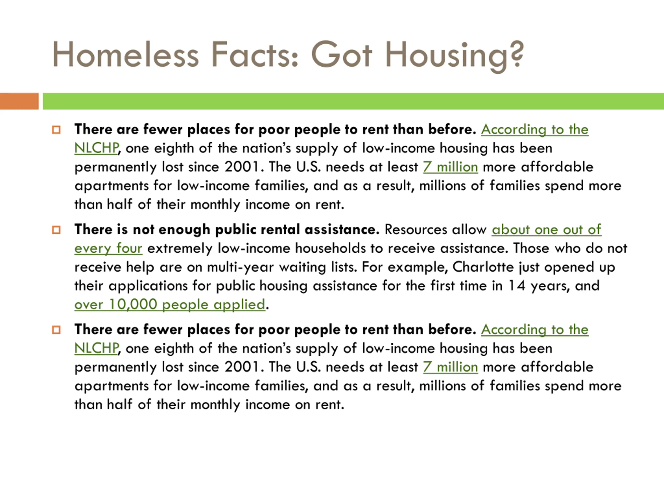 Homeless Facts: Got Housing? There are fewer places for poor people to rent than before. According to the NLCHP, one eighth of the nation s supply of low-income housing has been permanently lost since 2001. The U.S. needs at least 7 million more affordable apartments for low-income families, and as a result, millions of families spend more than half of their monthly income on rent. There is not enough public rental assistance. Resources allow about one out of every four extremely low-income households to receive assistance. Those who do not receive help are on multi-year waiting lists. For example, Charlotte just opened up their applications for public housing assistance for the first time in 14 years, and over 10,000 people applied. There are fewer places for poor people to rent than before. According to the NLCHP, one eighth of the nation s supply of low-income housing has been permanently lost since 2001. The U.S. needs at least 7 million more affordable apartments for low-income families, and as a result, millions of families spend more than half of their monthly income on rent.