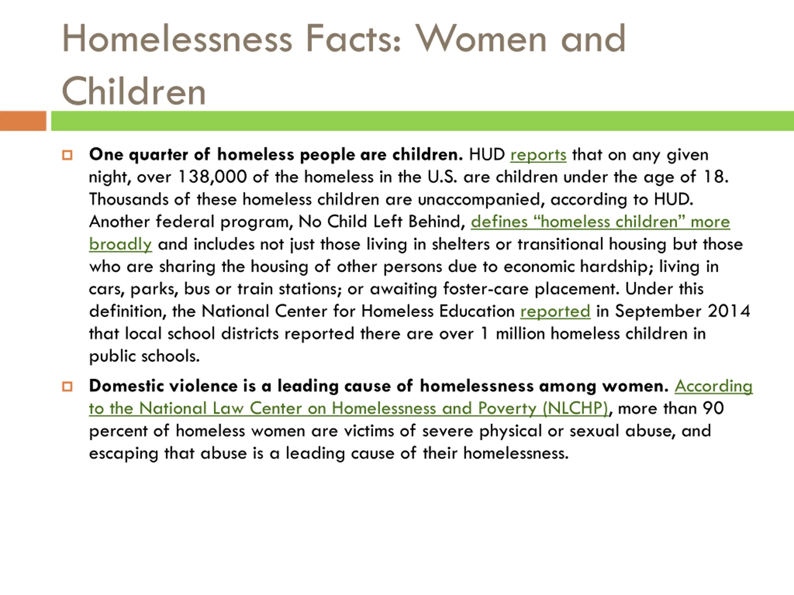 Homelessness Facts: Women and Children One quarter of homeless people are children. HUD reports that on any given night, over 138,000 of the homeless in the U.S. are children under the age of 18. Thousands of these homeless children are unaccompanied, according to HUD. Another federal program, No Child Left Behind, defines homeless children more broadly and includes not just those living in shelters or transitional housing but those who are sharing the housing of other persons due to economic hardship; living in cars, parks, bus or train stations; or awaiting foster-care placement. Under this definition, the National Center for Homeless Education reported in September 2014 that local school districts reported there are over 1 million homeless children in public schools. Domestic violence is a leading cause of homelessness among women. According to the National Law Center on Homelessness and Poverty (NLCHP), more than 90 percent of homeless women are victims of severe physical or sexual abuse, and escaping that abuse is a leading cause of their homelessness.