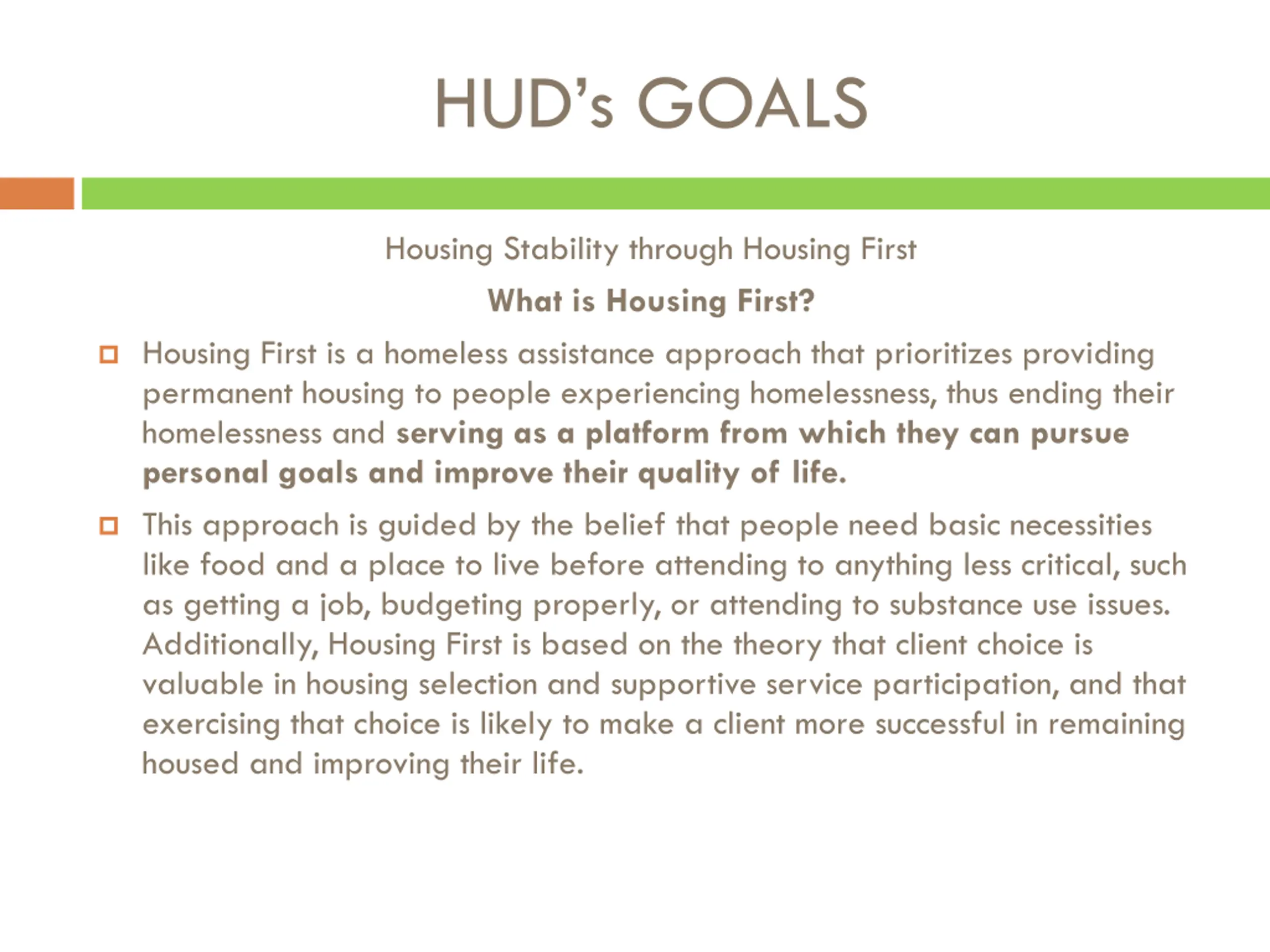HUDs GOALS Housing Stability through Housing First What is Housing First? Housing First is a homeless assistance approach that prioritizes providing permanent housing to people experiencing homelessness, thus ending their homelessness and serving as a platform from which they can pursue personal goals and improve their quality of life. This approach is guided by the belief that people need basic necessities like food and a place to live before attending to anything less critical, such as getting a job, budgeting properly, or attending to substance use issues. Additionally, Housing First is based on the theory that client choice is valuable in housing selection and supportive service participation, and that exercising that choice is likely to make a client more successful in remaining housed and improving their life.
