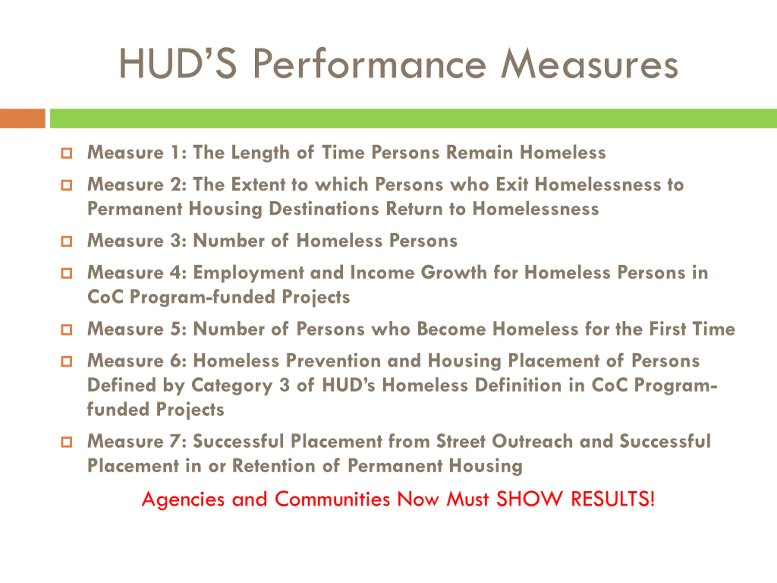 HUDS Performance Measures Measure 1: The Length of Time Persons Remain Homeless Measure 2: The Extent to which Persons who Exit Homelessness to Permanent Housing Destinations Return to Homelessness Measure 3: Number of Homeless Persons Measure 4: Employment and Income Growth for Homeless Persons in CoC Program-funded Projects Measure 5: Number of Persons who Become Homeless for the First Time Measure 6: Homeless Prevention and Housing Placement of Persons Defined by Category 3 of HUD s Homeless Definition in CoC Program- funded Projects Measure 7: Successful Placement from Street Outreach and Successful Placement in or Retention of Permanent Housing Agencies and Communities Now Must SHOW RESULTS!