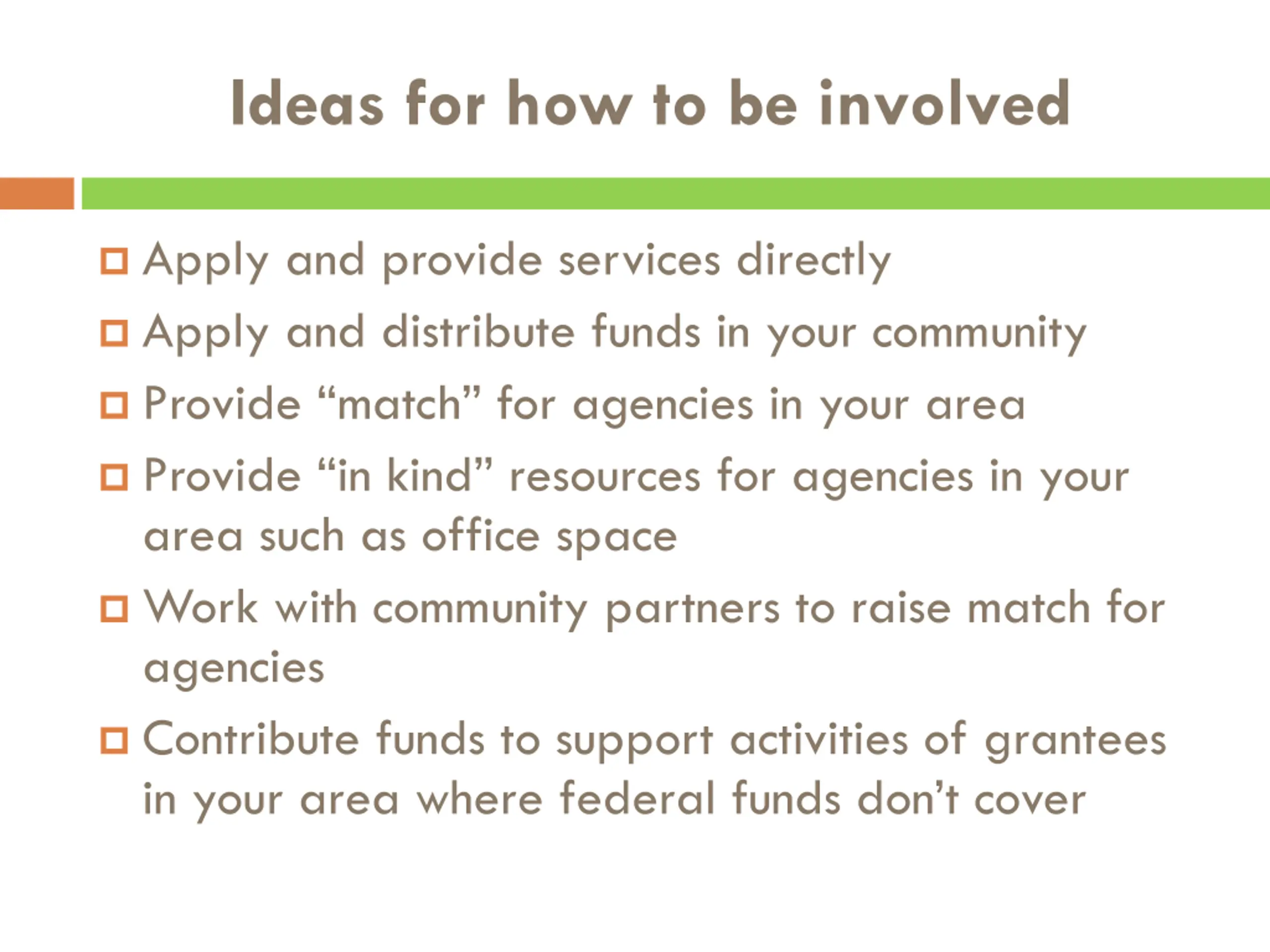 Ideas for how to be involved Apply and provide services directly Apply and distribute funds in your community Provide match for agencies in your area Provide in kind resources for agencies in your area such as office space Work with community partners to raise match for agencies Contribute funds to support activities of grantees in your area where federal funds don t cover