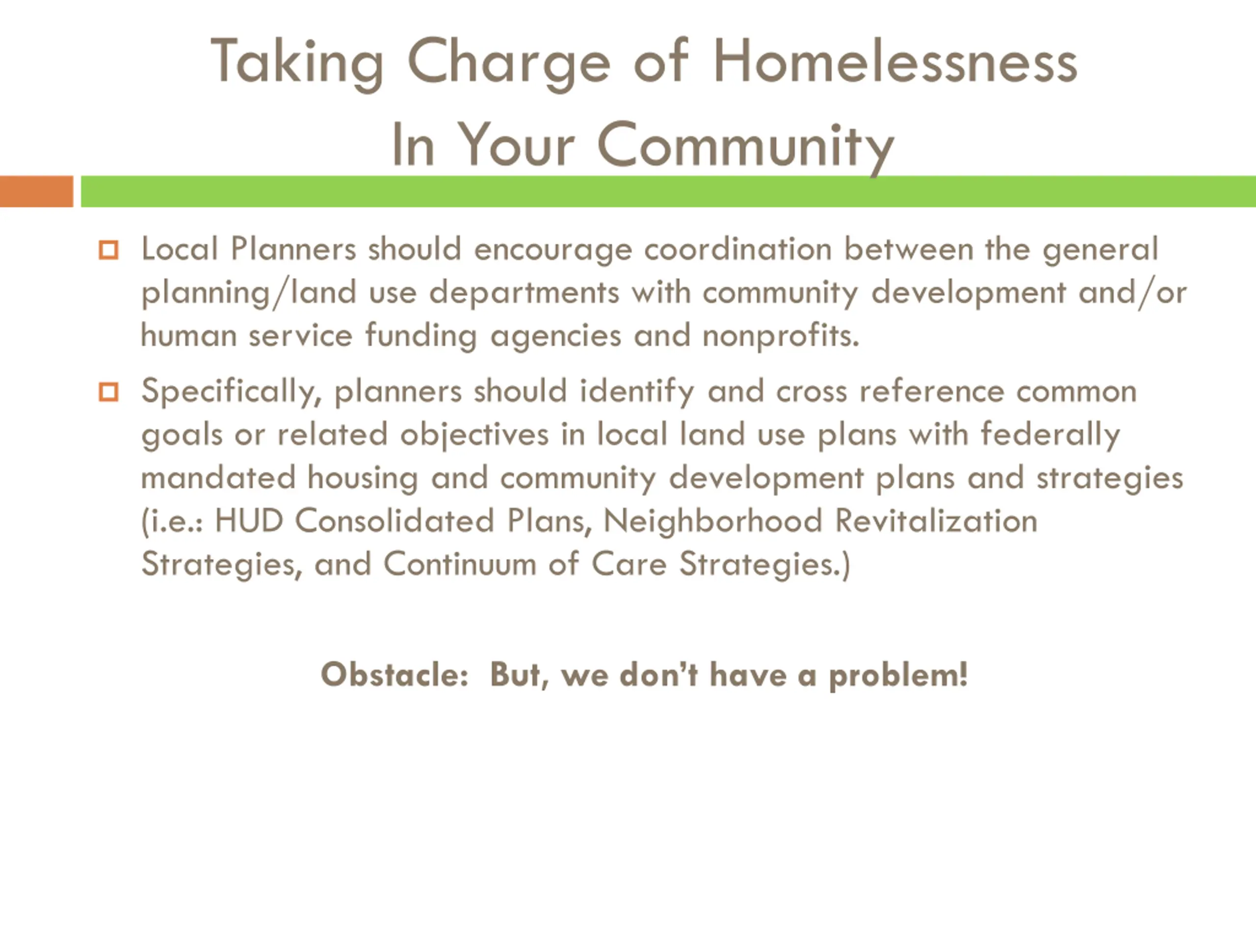 Taking Charge of Homelessness In Your Community Local Planners should encourage coordination between the general planning/land use departments with community development and/or human service funding agencies and nonprofits. Specifically, planners should identify and cross reference common goals or related objectives in local land use plans with federally mandated housing and community development plans and strategies (i.e.: HUD Consolidated Plans, Neighborhood Revitalization Strategies, and Continuum of Care Strategies.) Obstacle: But, we don t have a problem!