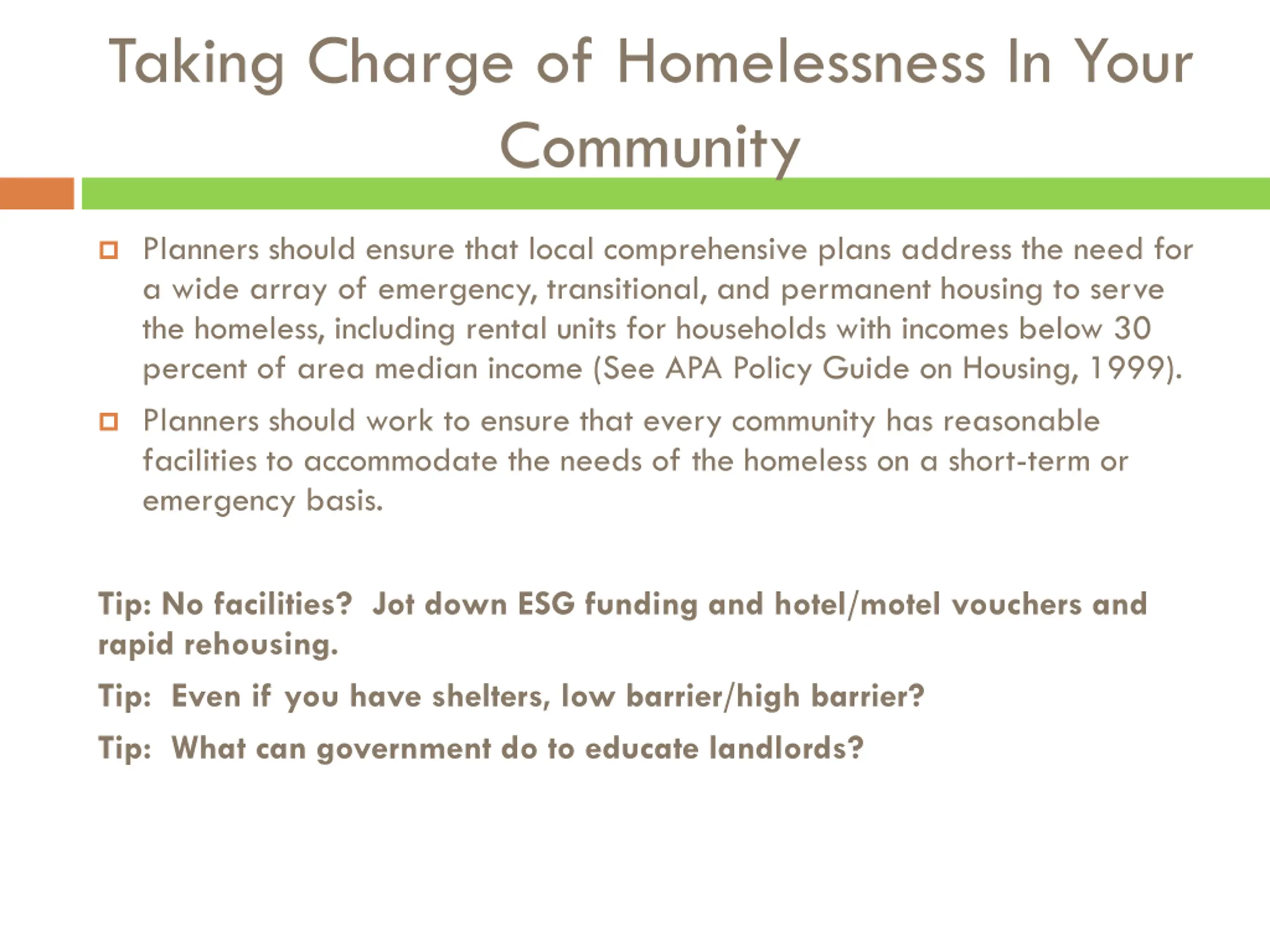 Taking Charge of Homelessness In Your Community Planners should ensure that local comprehensive plans address the need for a wide array of emergency, transitional, and permanent housing to serve the homeless, including rental units for households with incomes below 30 percent of area median income (See APA Policy Guide on Housing, 1999). Planners should work to ensure that every community has reasonable facilities to accommodate the needs of the homeless on a short-term or emergency basis. Tip: No facilities? Jot down ESG funding and hotel/motel vouchers and rapid rehousing. Tip: Even if you have shelters, low barrier/high barrier? Tip: What can government do to educate landlords?