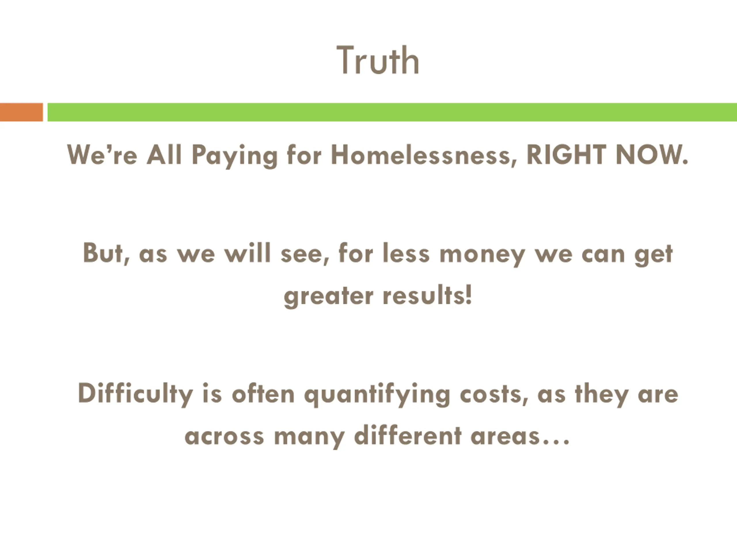 Truth We re All Paying for Homelessness, RIGHT NOW. But, as we will see, for less money we can get greater results! Difficulty is often quantifying costs, as they are across many different areas
