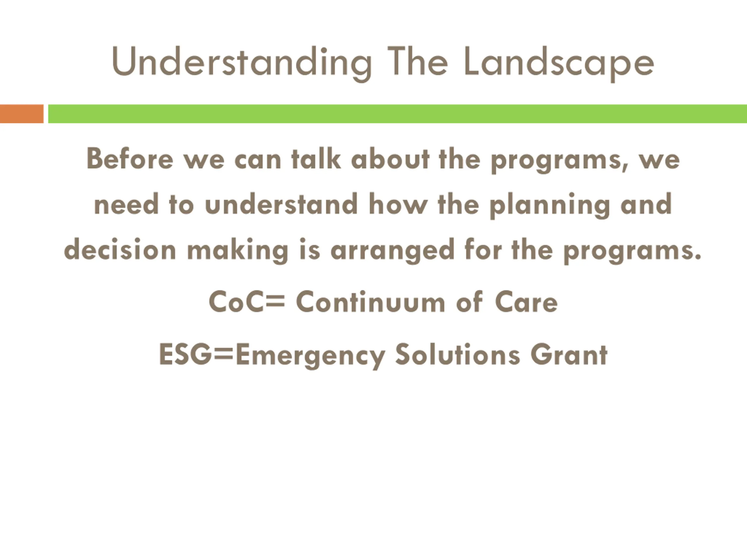 Understanding The Landscape Before we can talk about the programs, we need to understand how the planning and decision making is arranged for the programs. CoC= Continuum of Care ESG=Emergency Solutions Grant