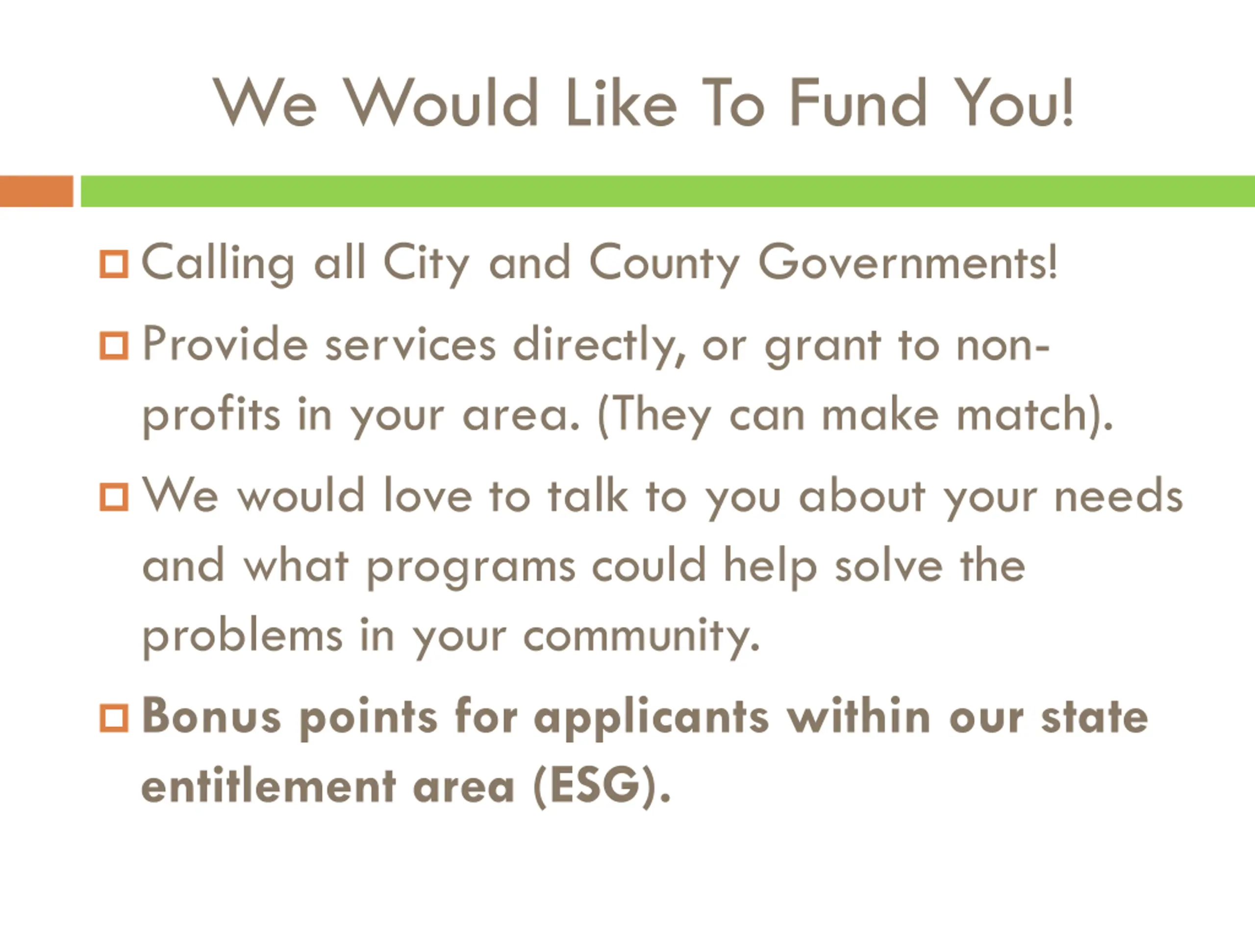 We Would Like To Fund You! Calling all City and County Governments! Provide services directly, or grant to non- profits in your area. (They can make match). We would love to talk to you about your needs and what programs could help solve the problems in your community. Bonus points for applicants within our state entitlement area (ESG).