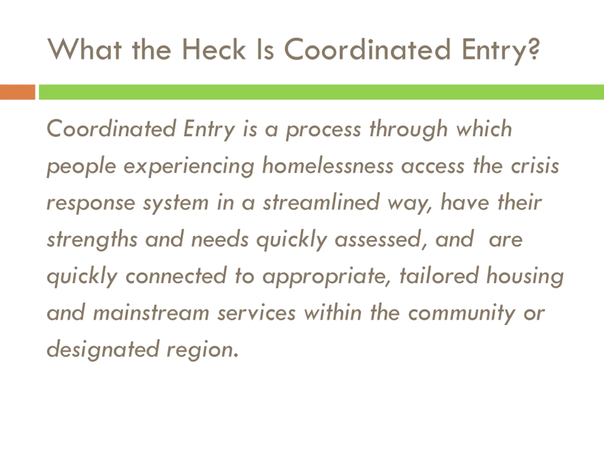 What the Heck Is Coordinated Entry? Coordinated Entry is a process through which people experiencing homelessness access the crisis response system in a streamlined way, have their strengths and needs quickly assessed, and are quickly connected to appropriate, tailored housing and mainstream services within the community or designated region.