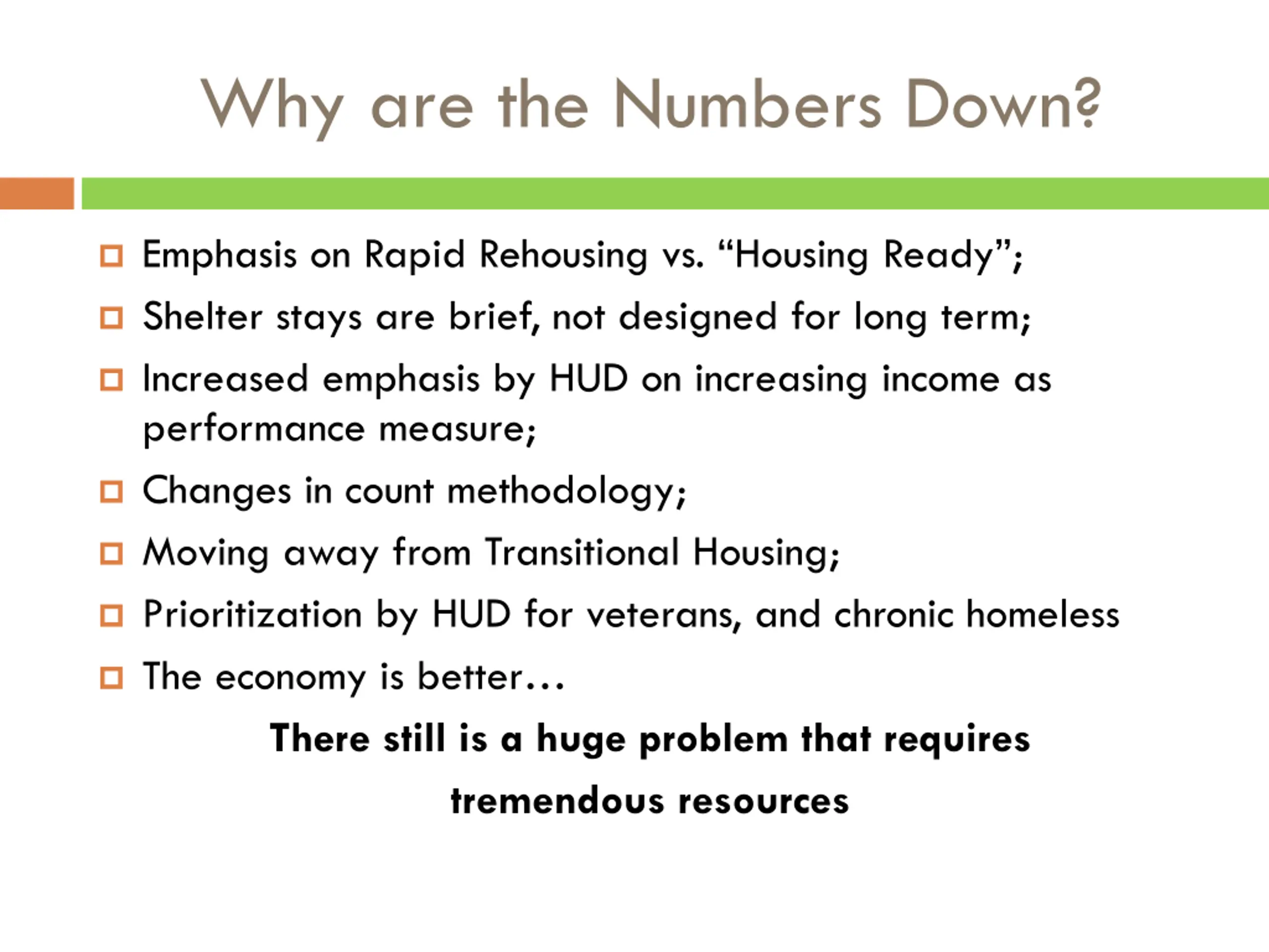 Why are the Numbers Down? Emphasis on Rapid Rehousing vs. Housing Ready ; Shelter stays are brief, not designed for long term; Increased emphasis by HUD on increasing income as performance measure; Changes in count methodology; Moving away from Transitional Housing; Prioritization by HUD for veterans, and chronic homeless The economy is better There still is a huge problem that requires tremendous resources