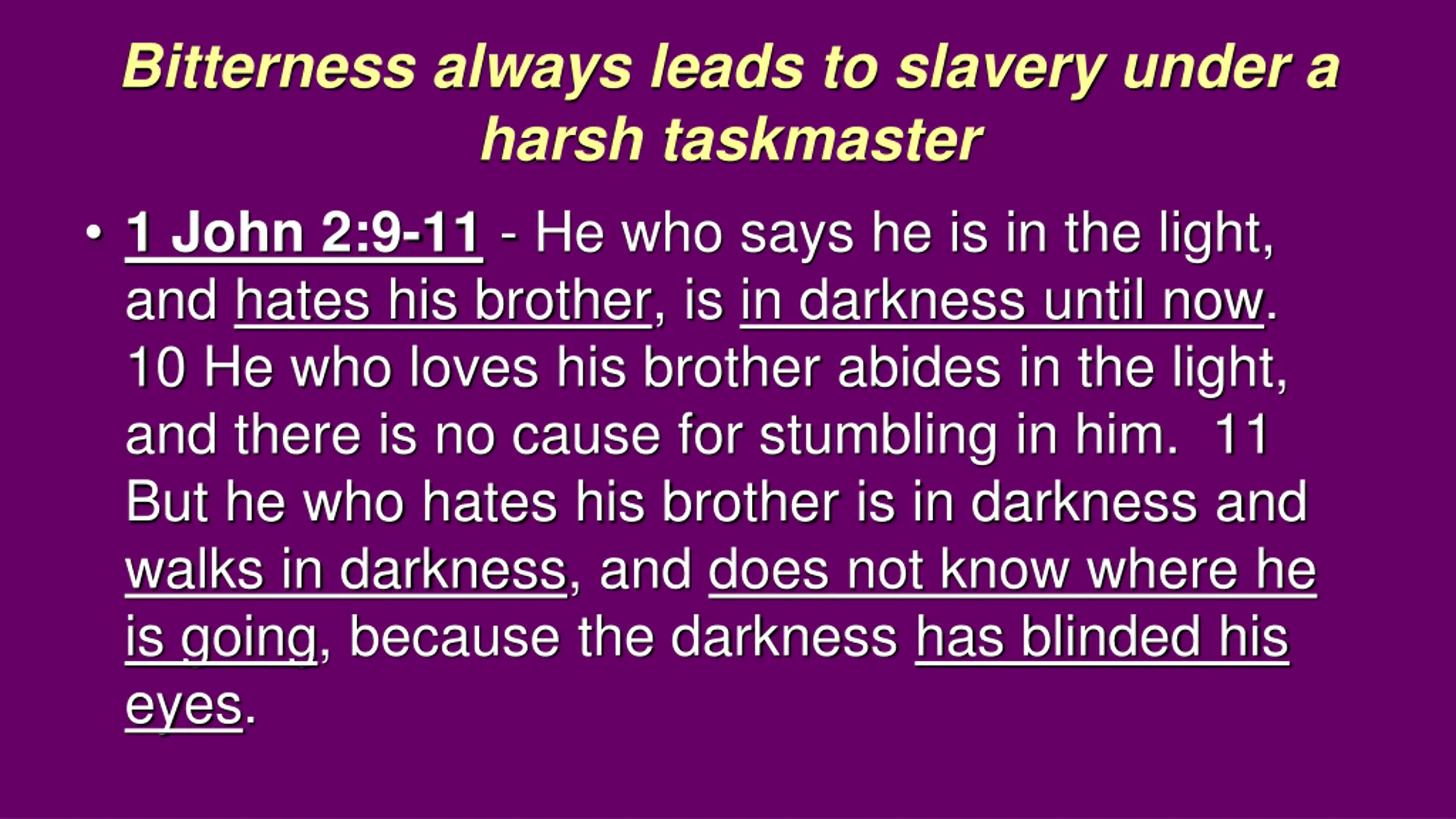 Bitterness always leads to slavery under a harsh taskmaster 1 John 2:9-11 - He who says he is in the light, and hates his brother, is in darkness until now. 10 He who loves his brother abides in the light, and there is no cause for stumbling in him. 11 But he who hates his brother is in darkness and walks in darkness, and does not know where he is going, because the darkness has blinded his eyes.