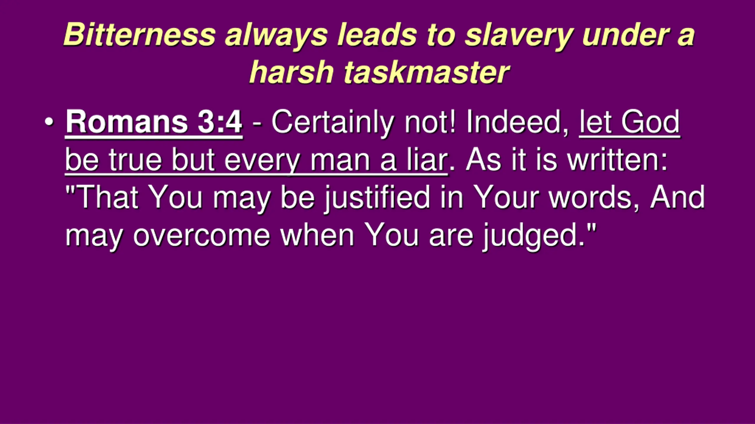 Bitterness always leads to slavery under a harsh taskmaster Romans 3:4 - Certainly not! Indeed, let God be true but every man a liar. As it is written: "That You may be justified in Your words, And may overcome when You are judged."
