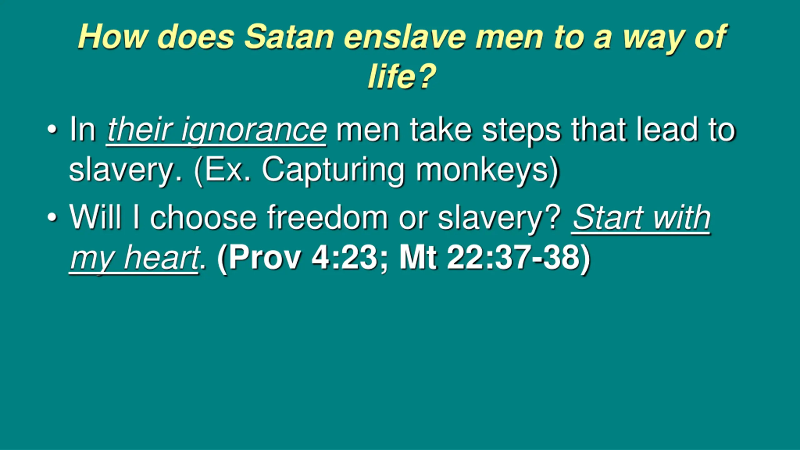 How does Satan enslave men to a way of life? In their ignorance men take steps that lead to slavery. (Ex. Capturing monkeys) Will I choose freedom or slavery? Start with my heart. (Prov 4:23; Mt 22:37-38)