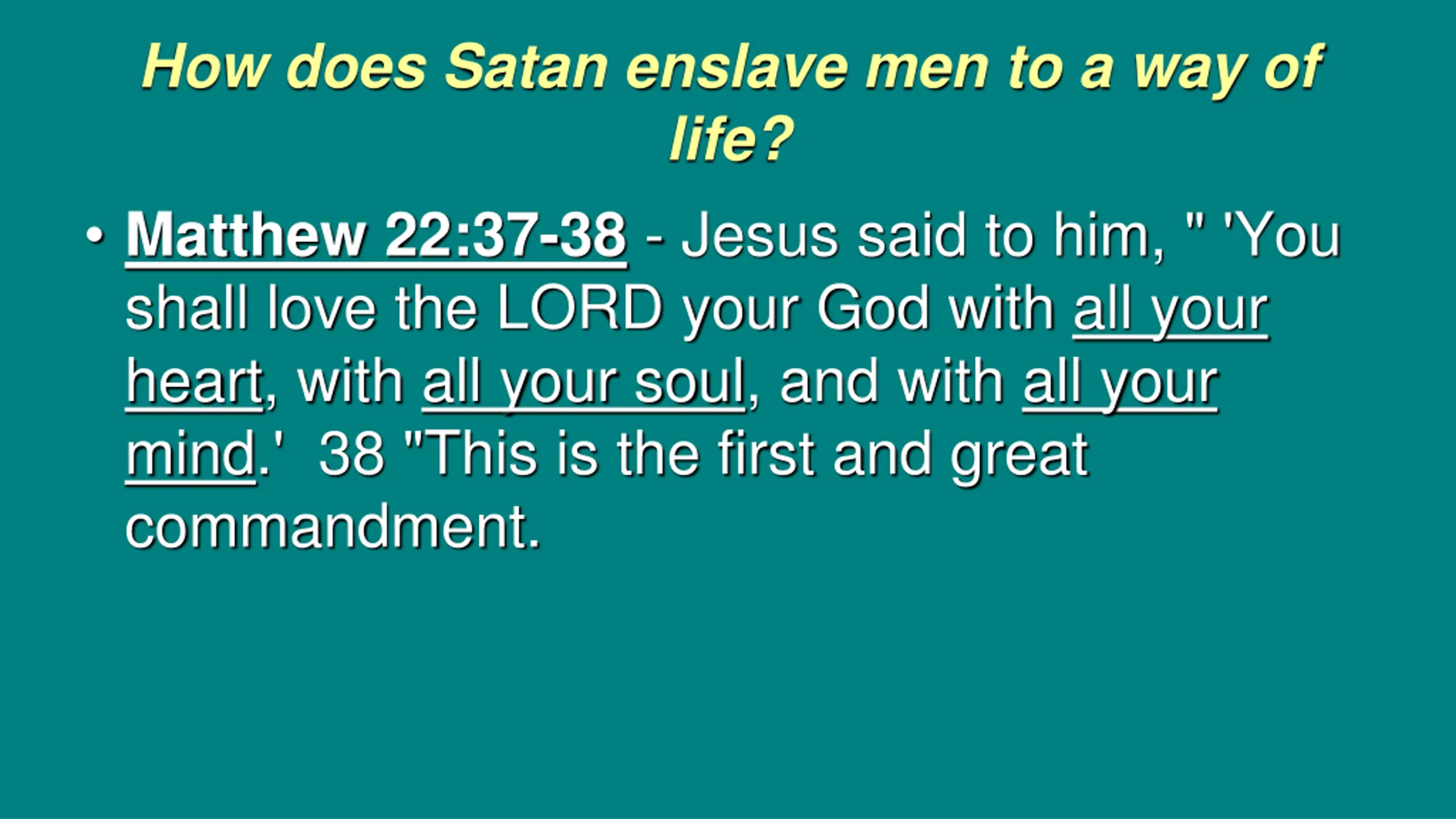 How does Satan enslave men to a way of life? Matthew 22:37-38 - Jesus said to him, " 'You shall love the LORD your God with all your heart, with all your soul, and with all your mind.' 38 "This is the first and great commandment.