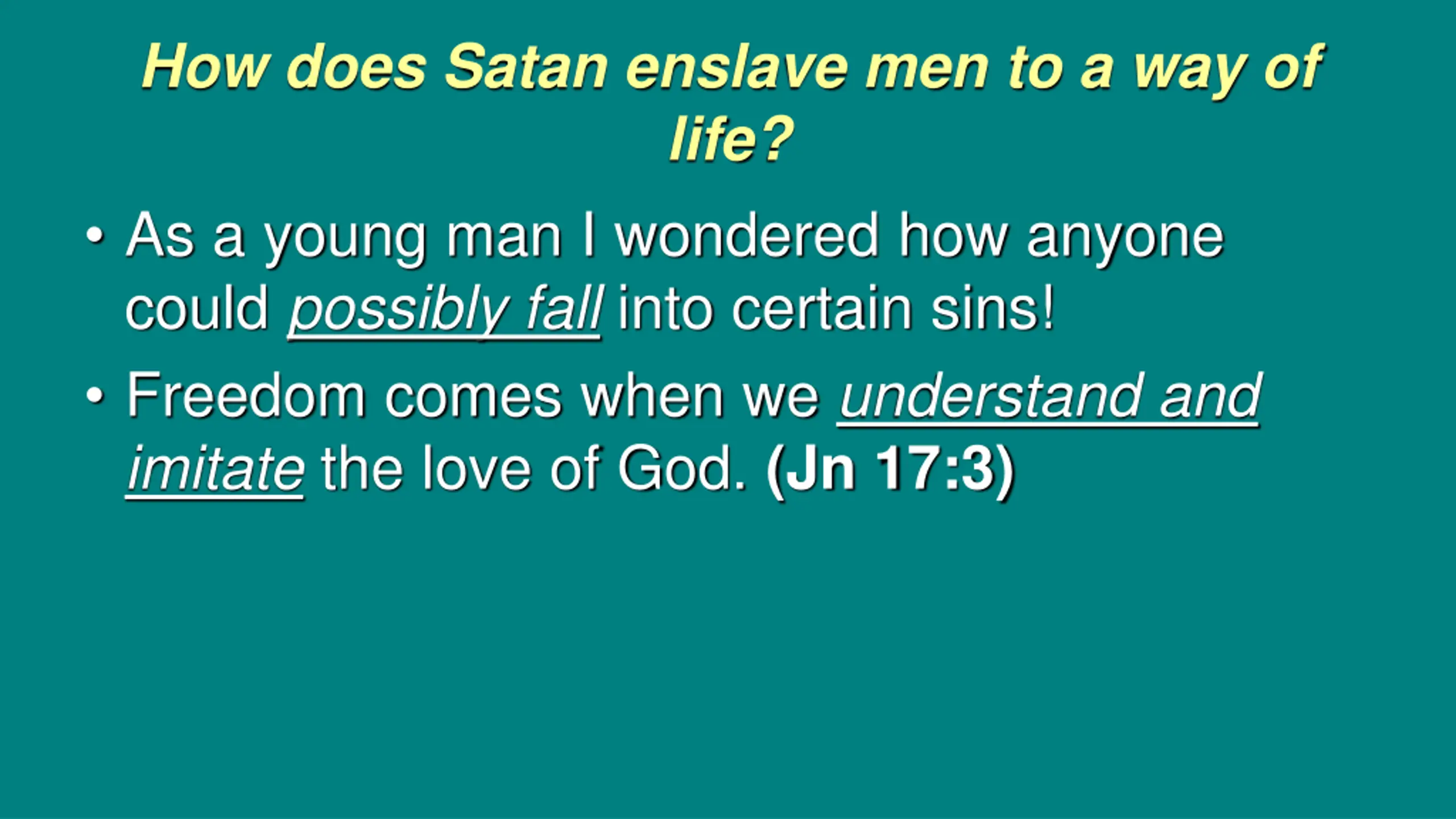 How does Satan enslave men to a way of life? As a young man I wondered how anyone could possibly fall into certain sins! Freedom comes when we understand and imitate the love of God. (Jn 17:3)