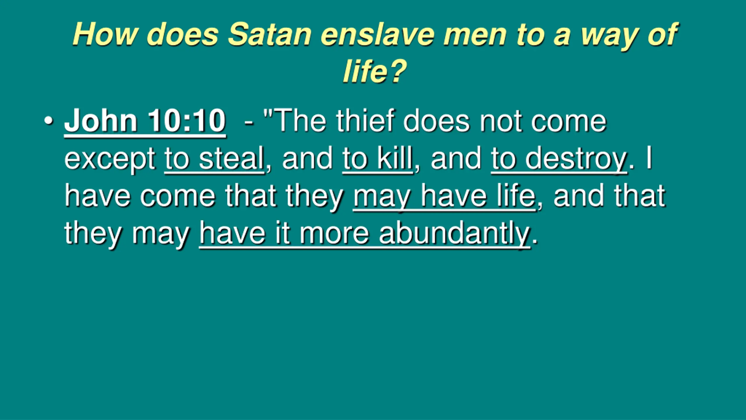 How does Satan enslave men to a way of life? John 10:10 - "The thief does not come except to steal, and to kill, and to destroy. I have come that they may have life, and that they may have it more abundantly.