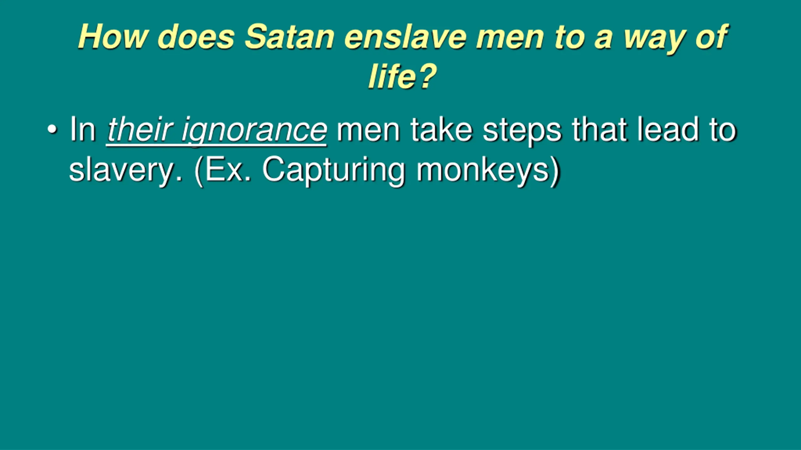How does Satan enslave men to a way of life? In their ignorance men take steps that lead to slavery. (Ex. Capturing monkeys)