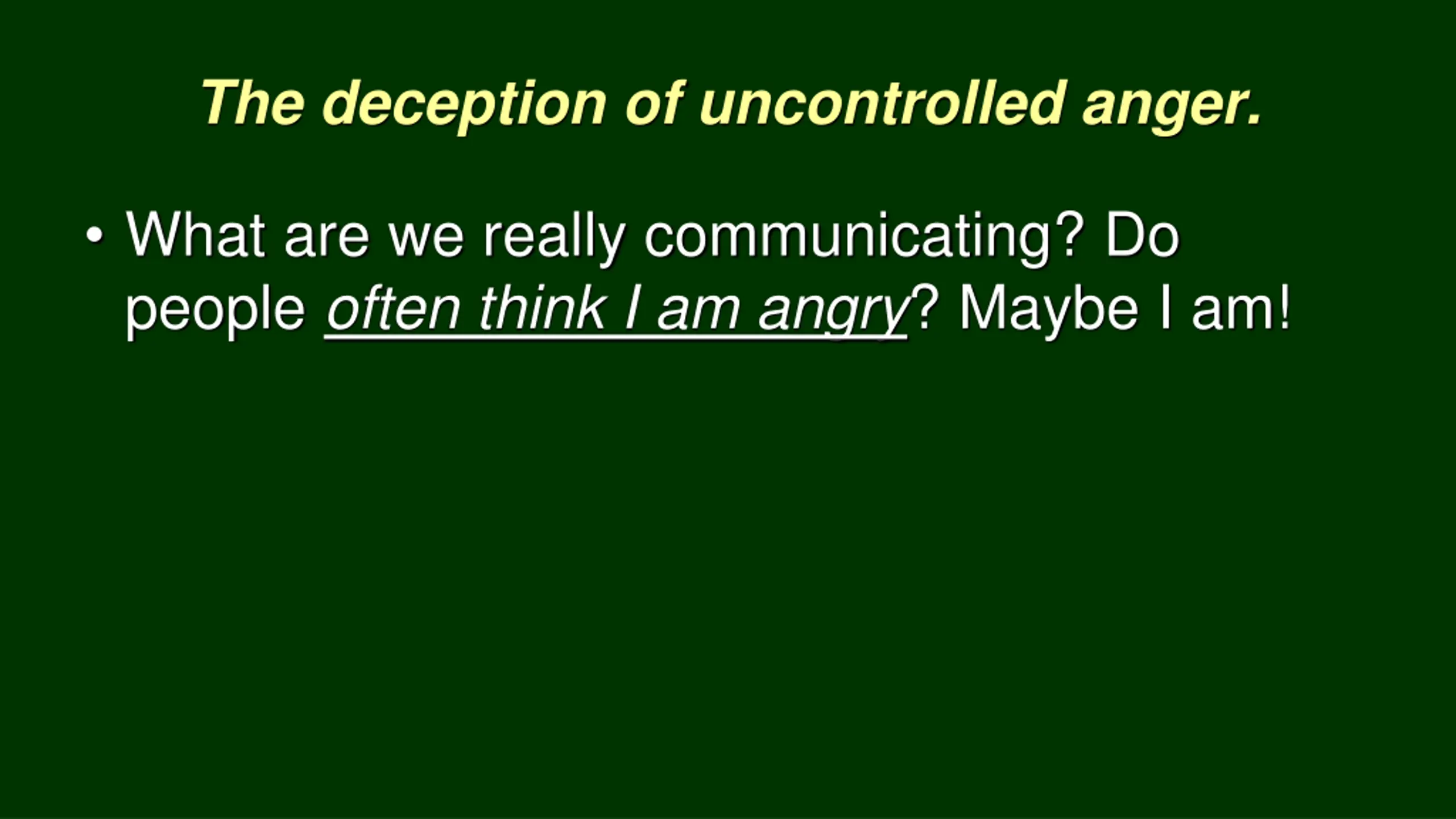The deception of uncontrolled anger. What are we really communicating? Do people often think I am angry? Maybe I am!