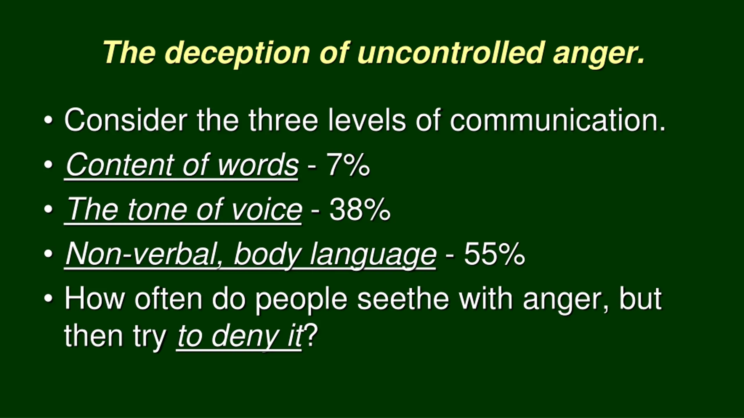 The deception of uncontrolled anger. Consider the three levels of communication. Content of words - 7% The tone of voice - 38% Non-verbal, body language - 55% How often do people seethe with anger, but then try to deny it?