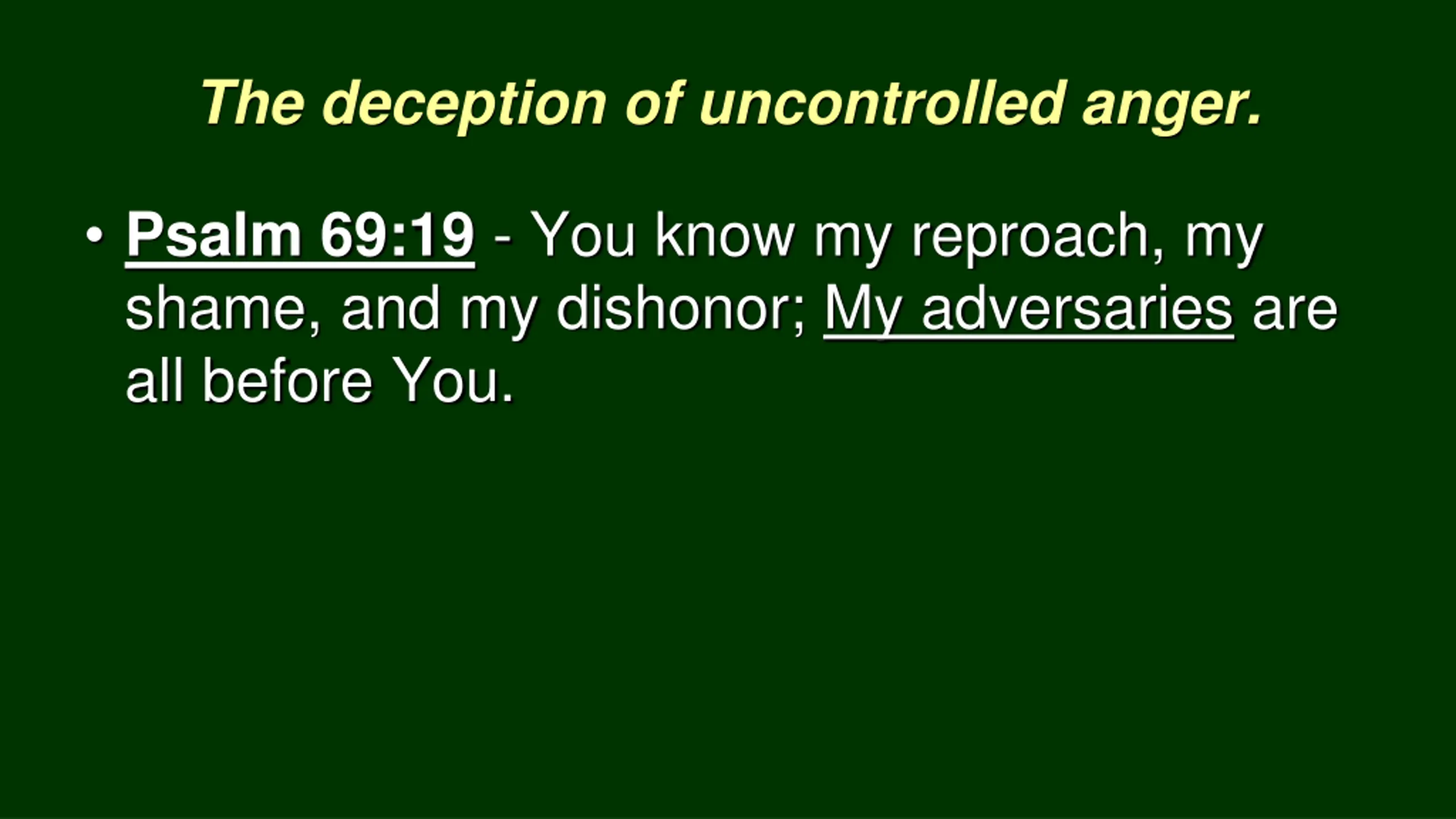 The deception of uncontrolled anger. Psalm 69:19 - You know my reproach, my shame, and my dishonor; My adversaries are all before You.