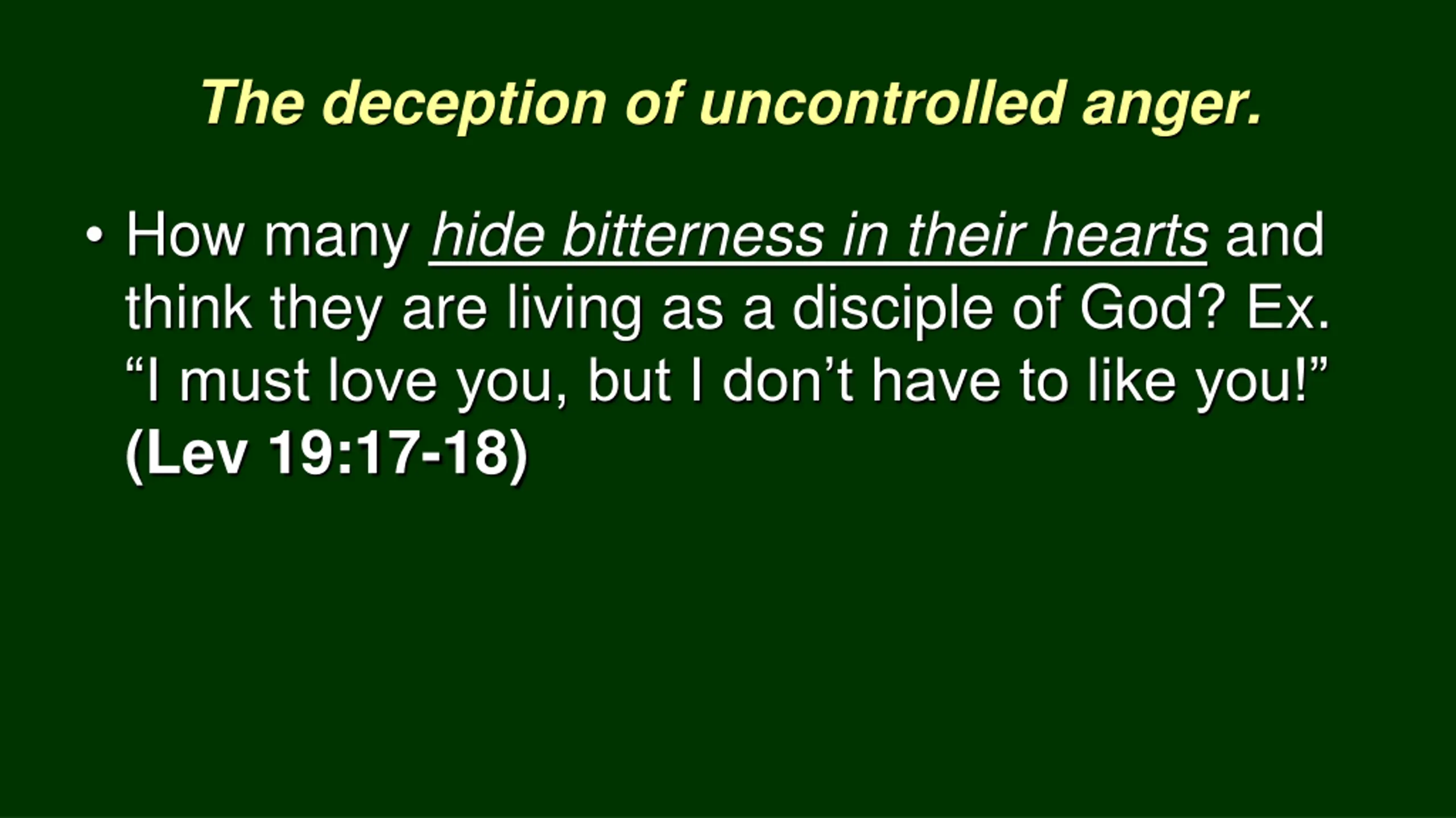 The deception of uncontrolled anger. How many hide bitterness in their hearts and think they are living as a disciple of God? Ex. I must love you, but I don t have to like you! (Lev 19:17-18)